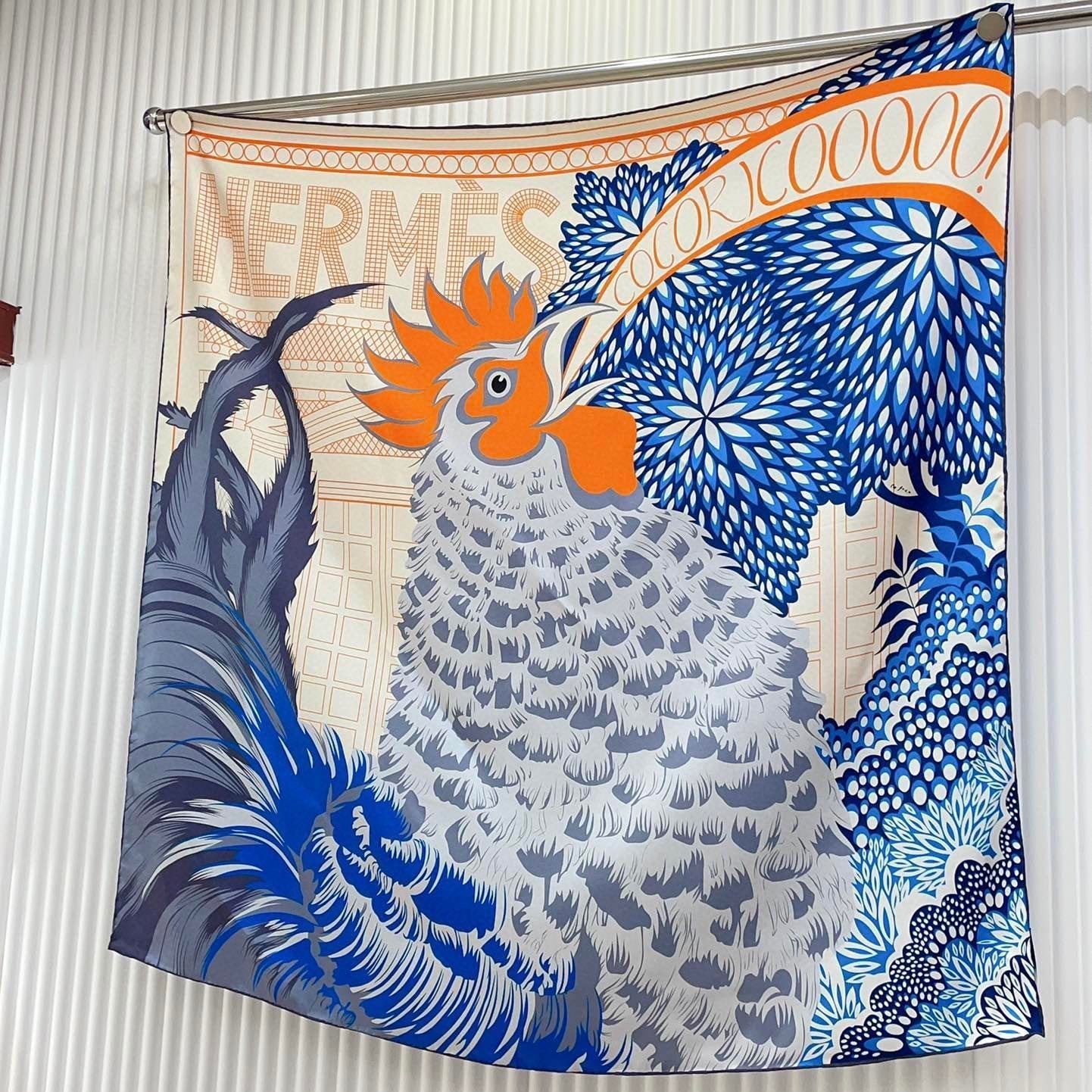 Cocoricooooo! Scarf 90 CM In Blue Orange Colorful Silk Twill 348775