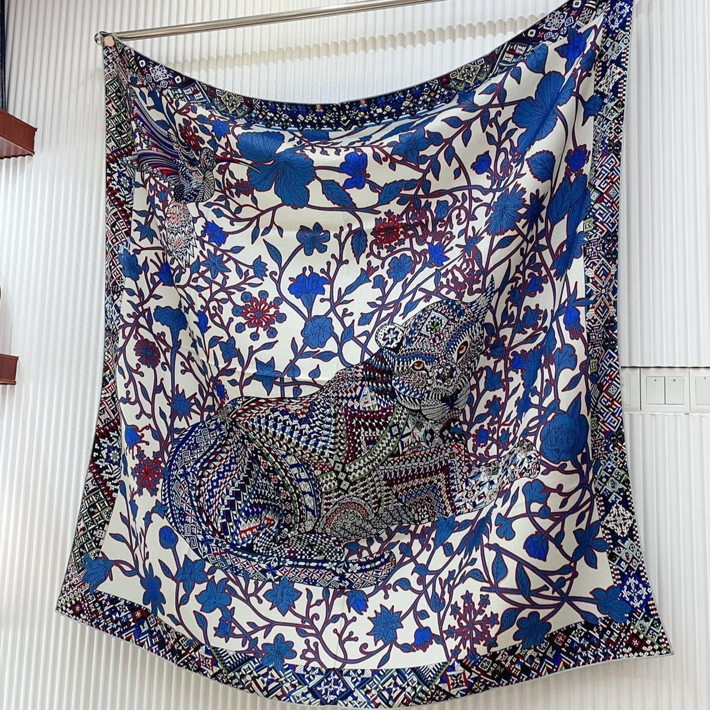 Le Jaguar Et Le Colibri Shawl 135 CM Blue Colorful Cashmere And Silk 357902