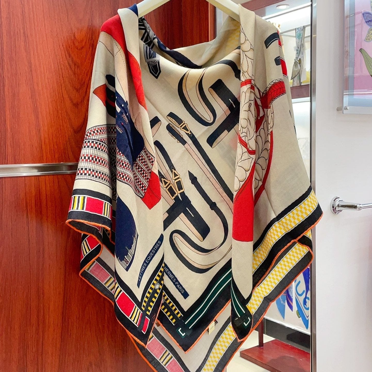 HM Lettres Equestre Scarf 140 CM In Orange Green Colorful Cashmere And Silk 359398