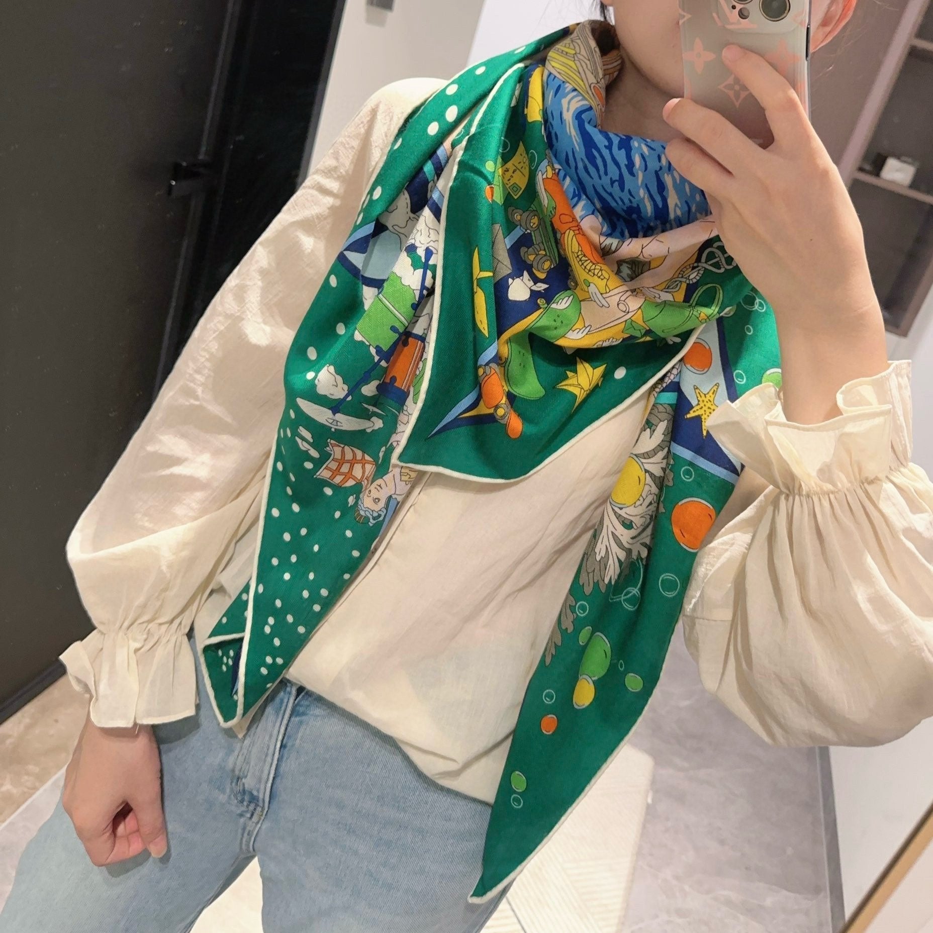 Choregraphie Equestre Pareo Scarf 140 CM Teal Blue Colorful Cashmere And Silk 393171