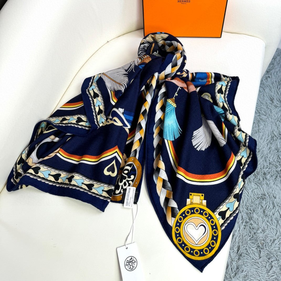 Chevaux Dechaines Shawl 135 CM IN Dark Blue Colorful Cashmere Silk 373682