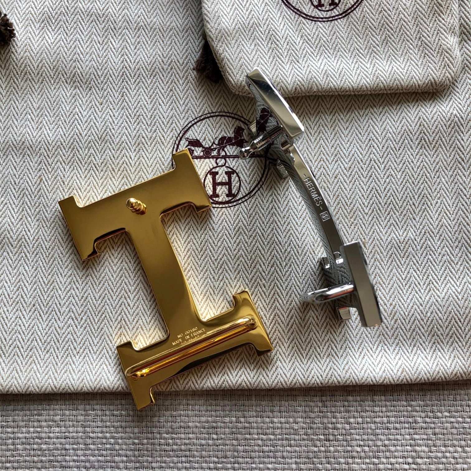 HM MAILLON H BELT BUCKLE & REVERSIBLE WHITE LEATHER STRAP 13 MM GOLD HARDWARE