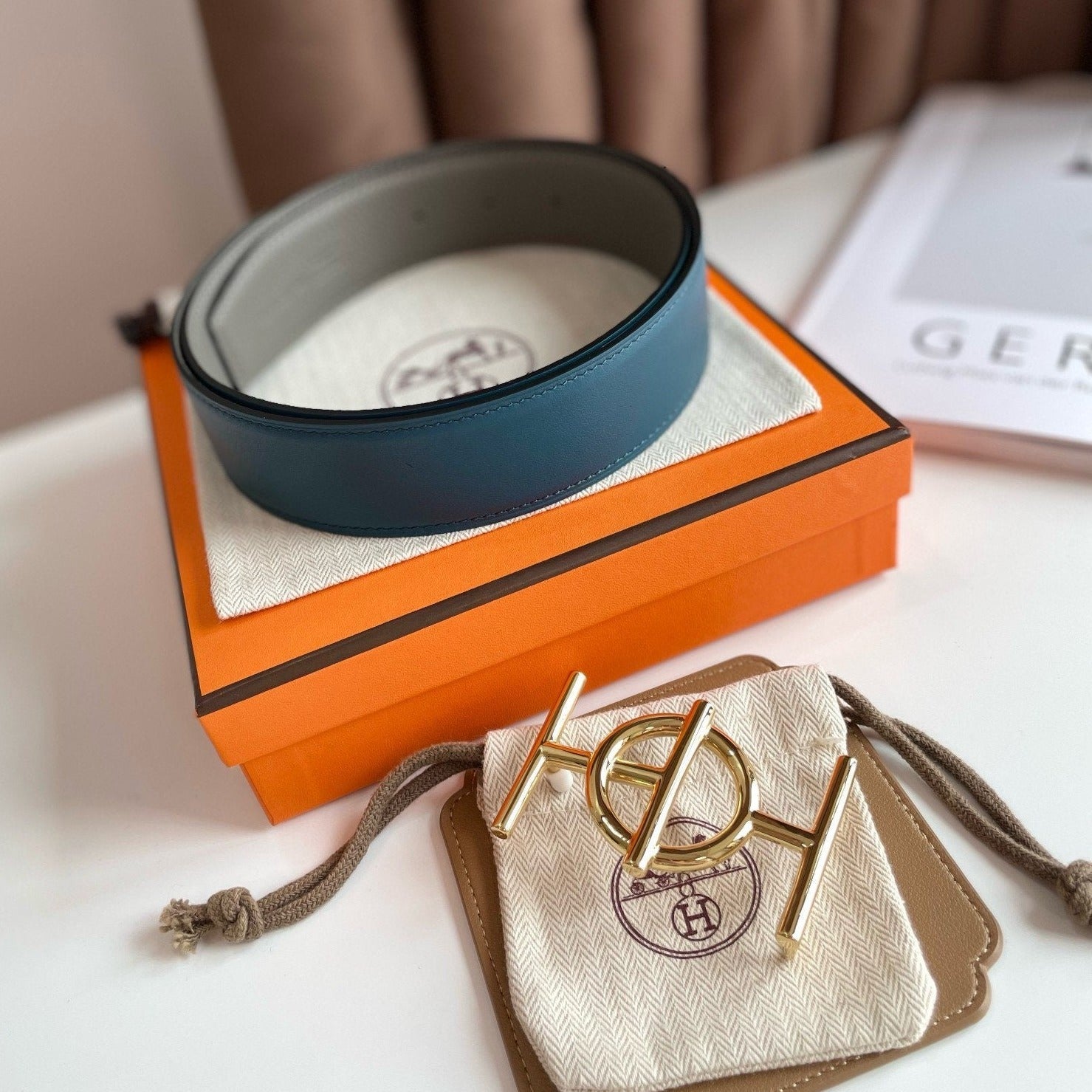 H CONTANCE BELT 38MM GOLD BUCKLE GOLD BLUE LEATHER