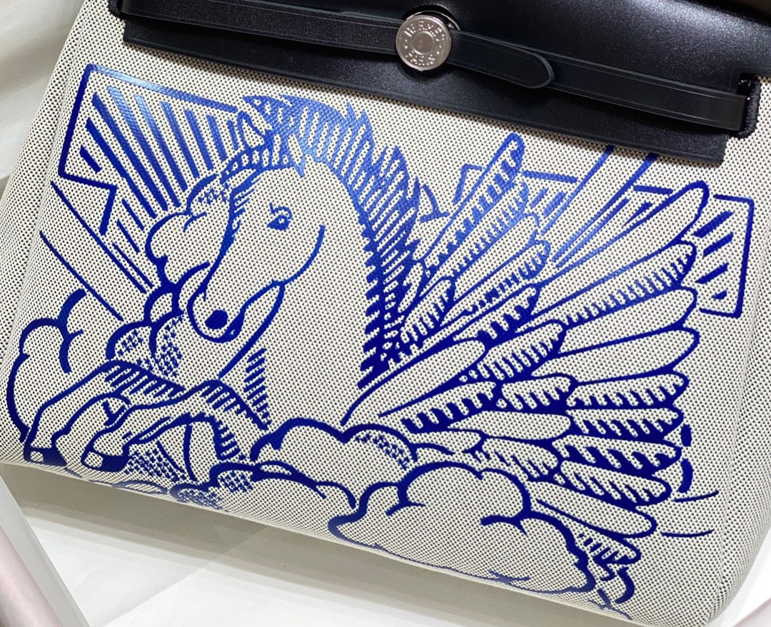 HM Pegase Pop Herbag Zip 31 White Blue Canvas Black Cowhide Leather