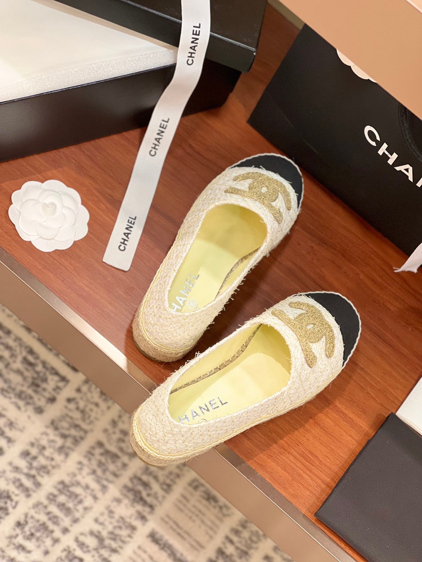 cc espadrilles gold white tweed black grosgrain