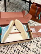Loro Piana Blue Sky White Suede Charms Walk Flat Mules