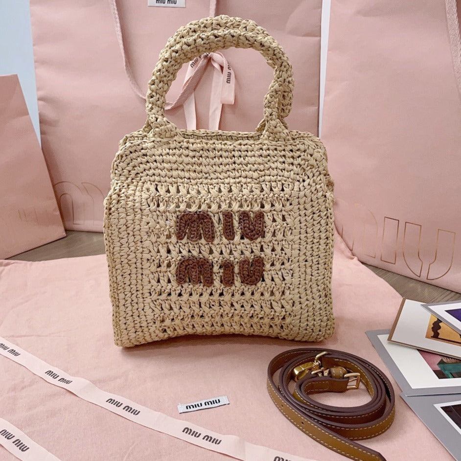 miu tote bag 22cm beige woven fabric