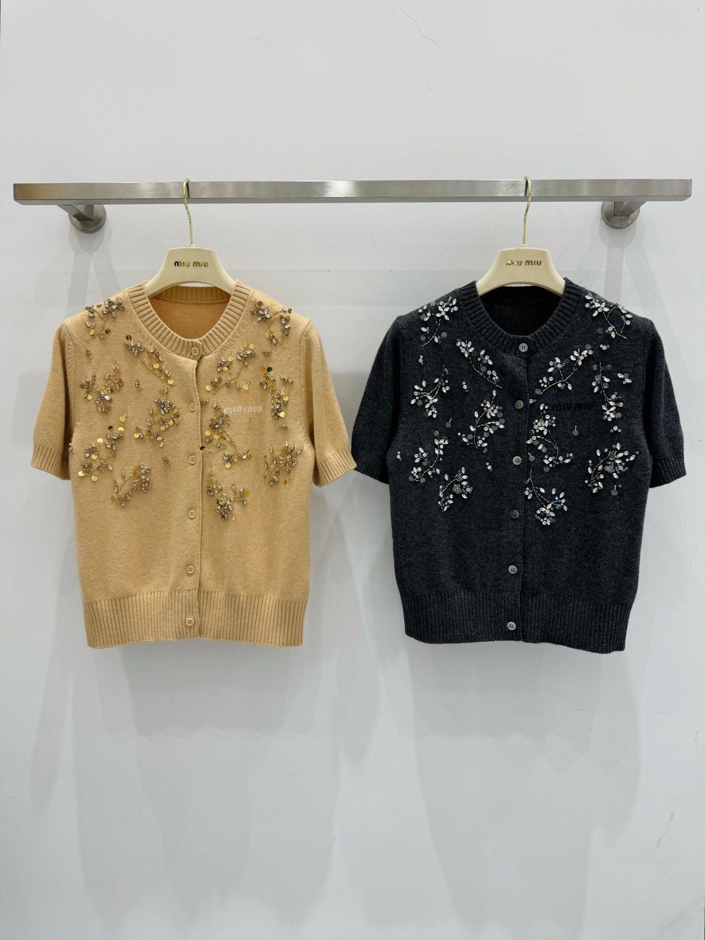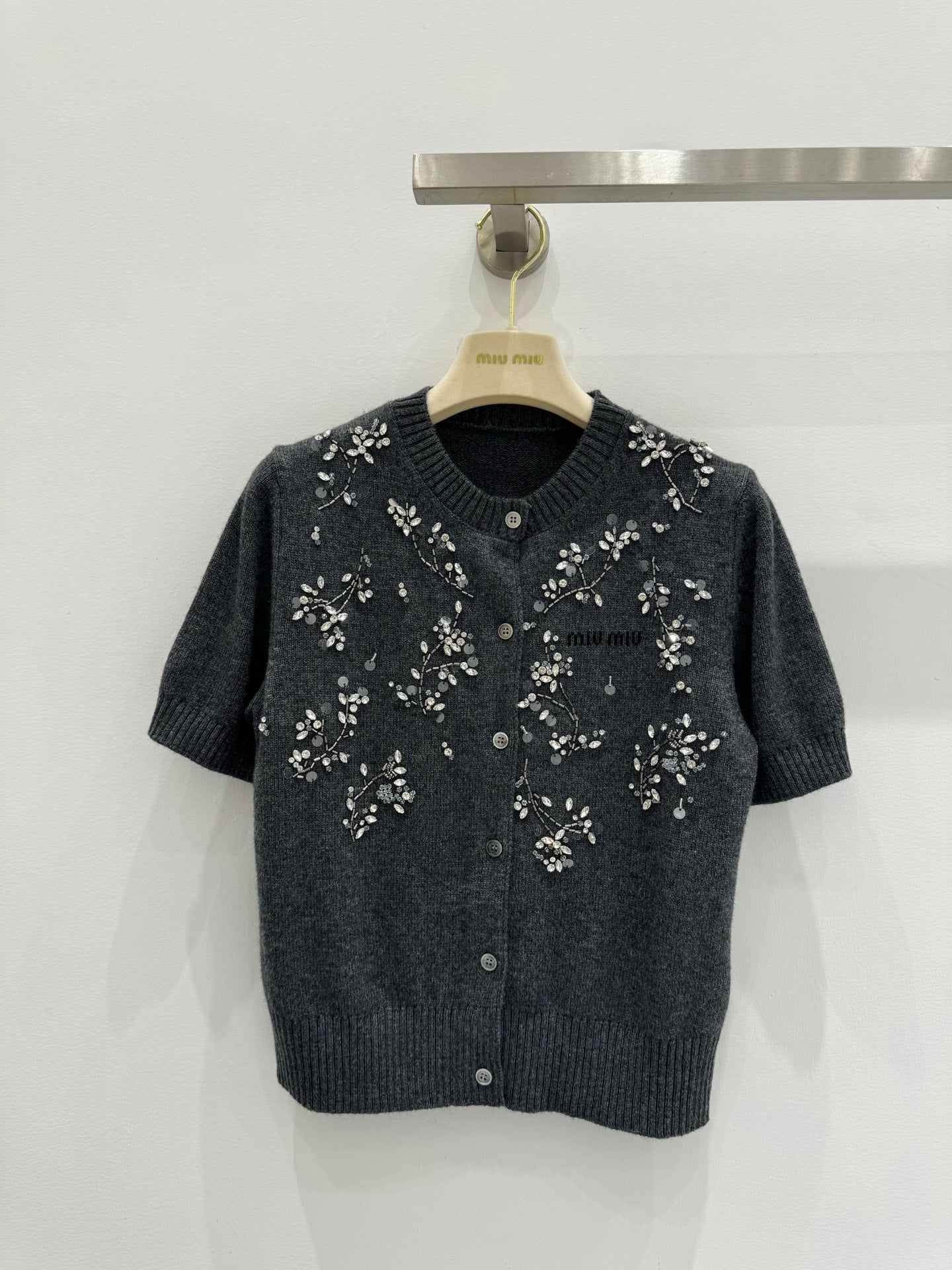 Miu Embroidered Cashmere Short Sleeve Cardigan 229364