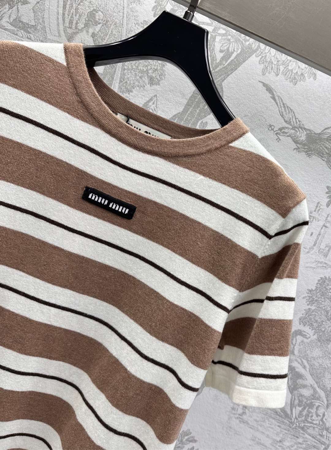 Miu Miu 25 Striped Round Neck Short-sleeved T-shirt Brown Cotton