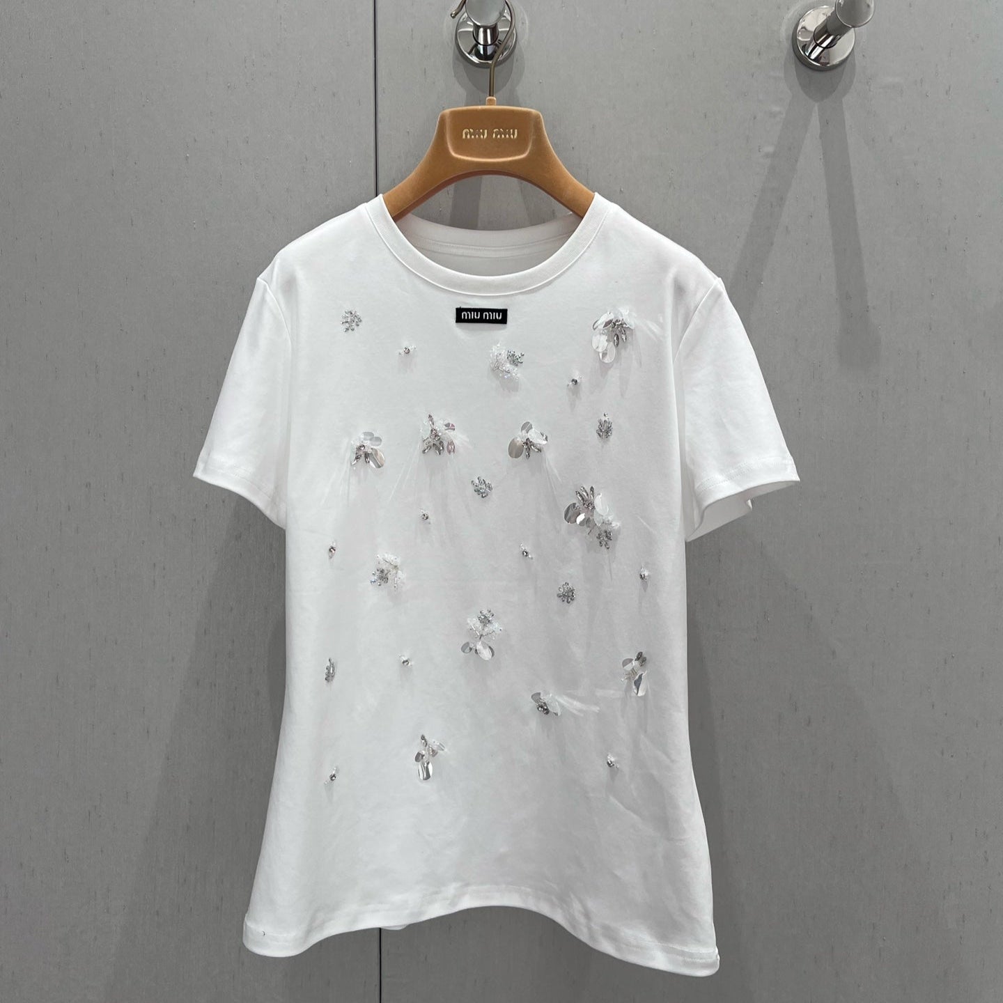 Miu Miu 25 beaded sequined flower short-sleeved T-shirt White Cotton 210497