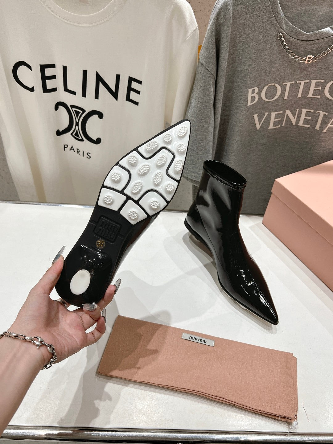 Miu Ankle Boots Pointed Toe Glossy Black Lambskin