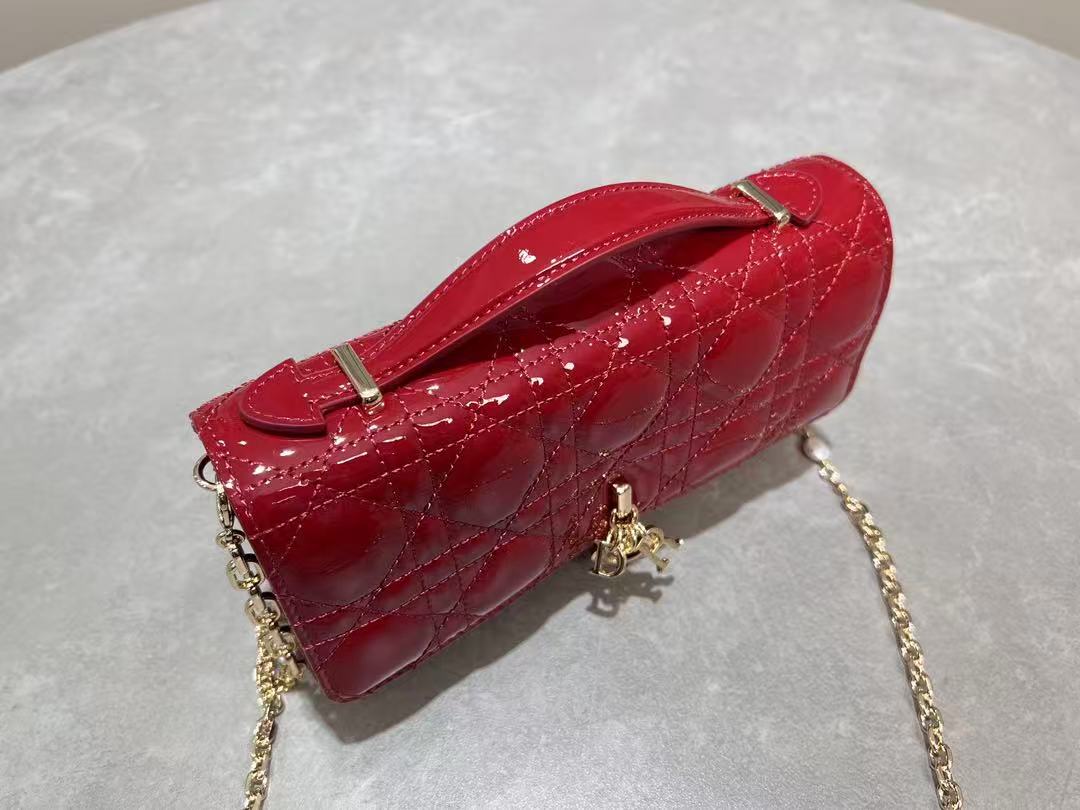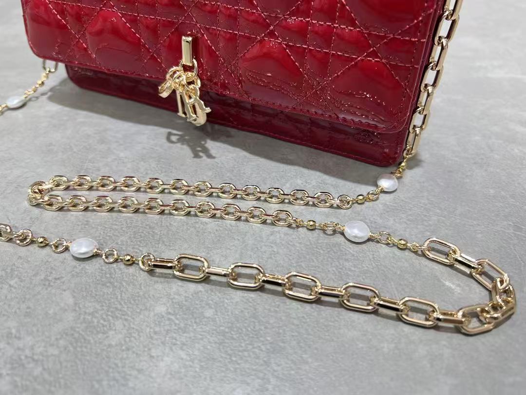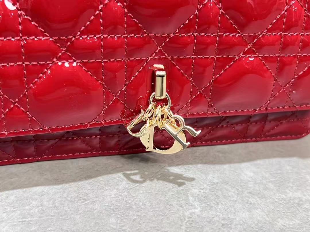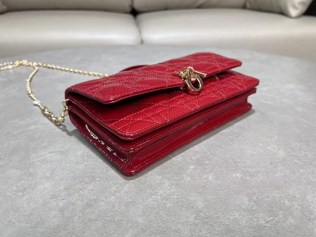 CD Pouch With Chain Cherry Red Patent Cannage Calfskin