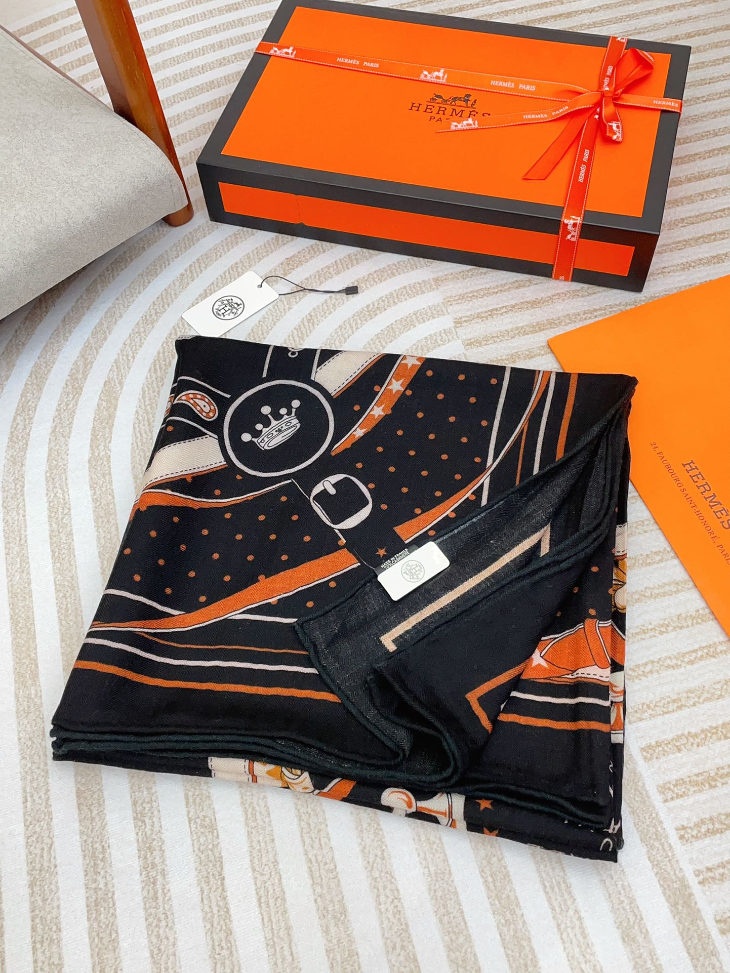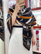 Square Scarf 140CM Black Mix Orange White Cashmere And Silk