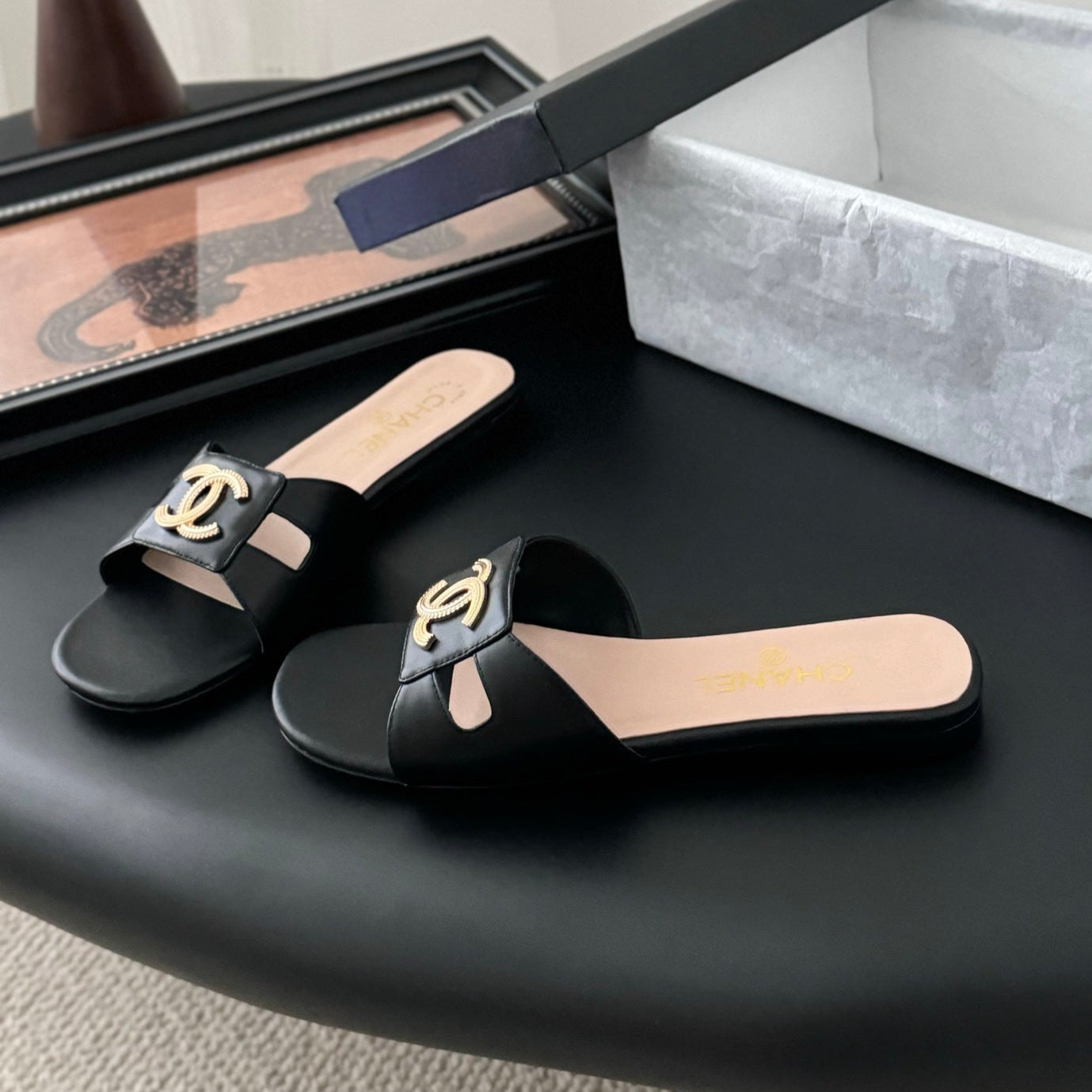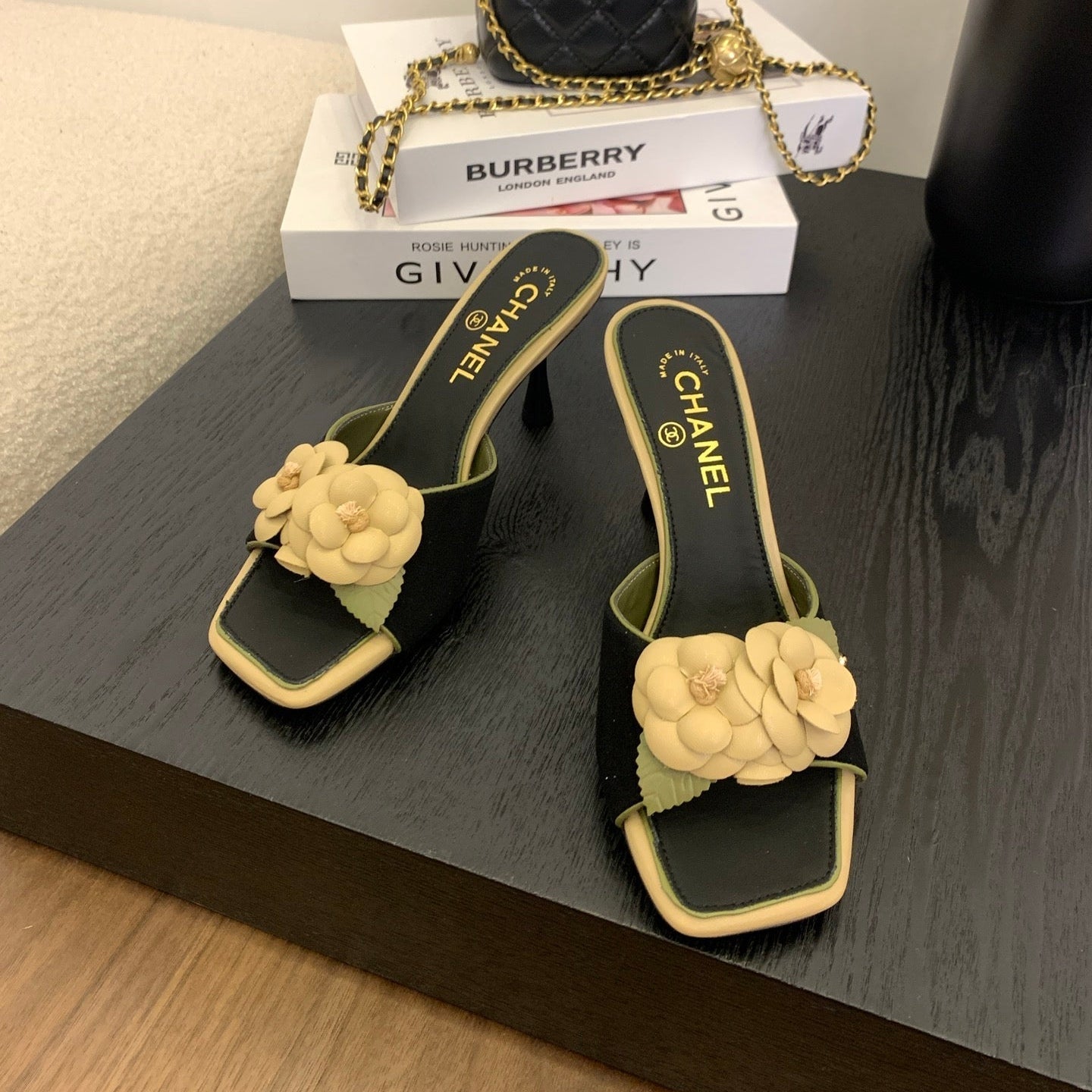 CC 25 Flower Thong Slippers Black Cowhide 233414