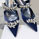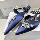 Manolo Flats Mules Crystal Navy Blue Silk Satin 327470