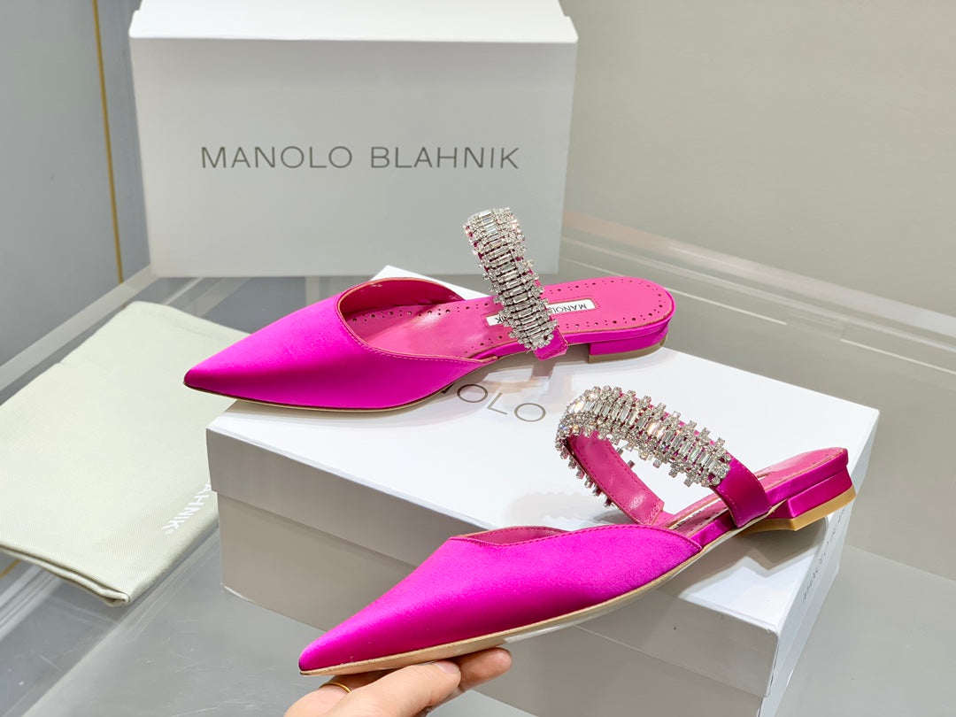 Manolo Flats Mules Diamond Buckle Dark Pink Silk Satin 327481