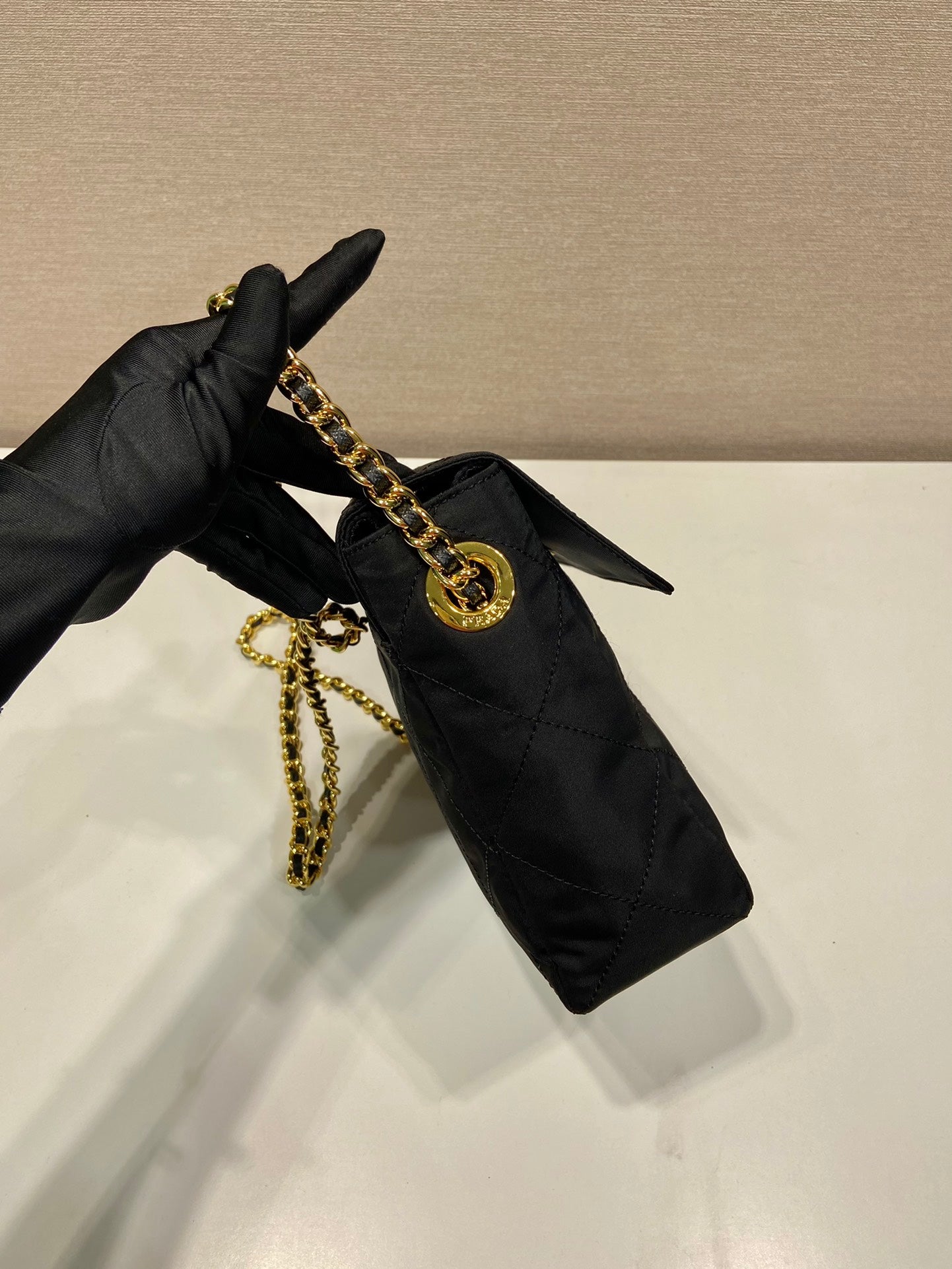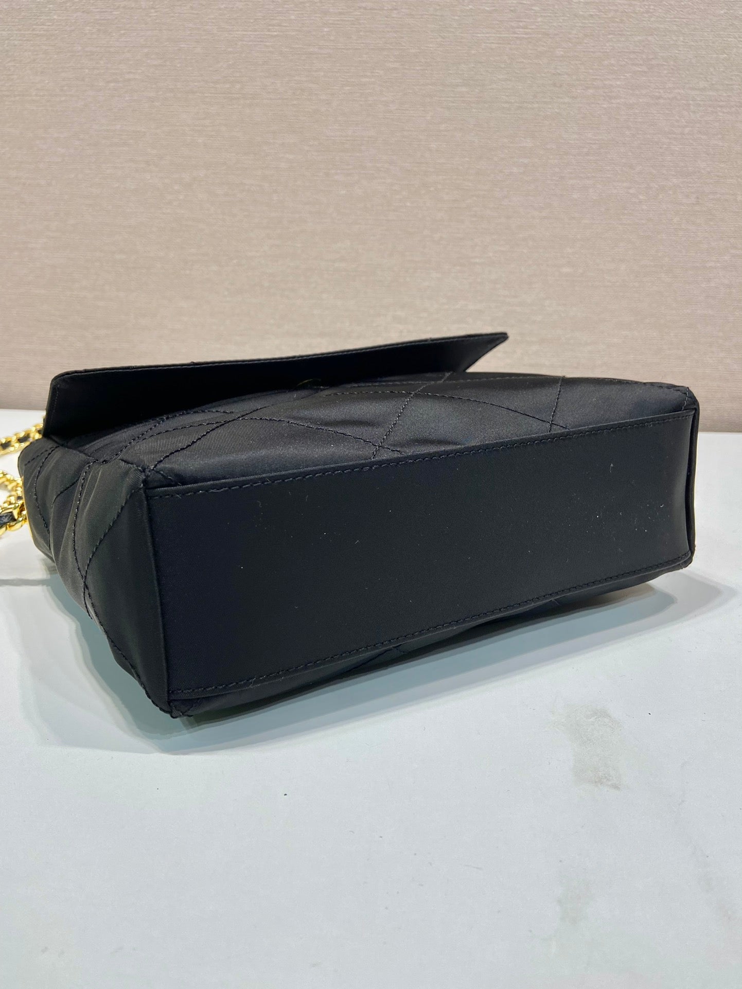 LARGE QUILTED FLAP BAG 23 IN BLACK RE-NYLON FABRIC GOLD CHAIN