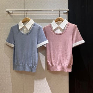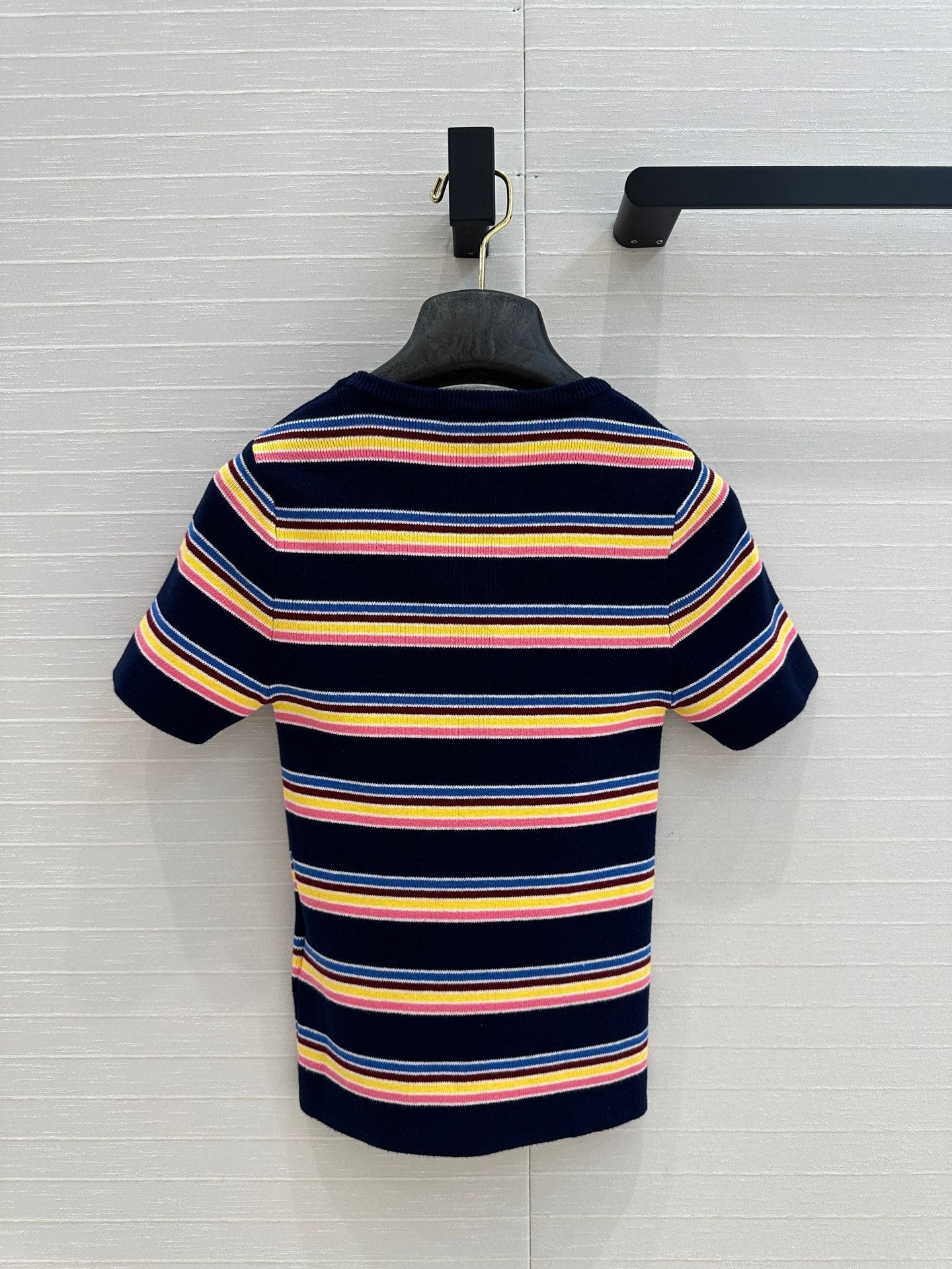 Prada 25 Striped Short-sleeved Knitted Top Blue white red Cotton