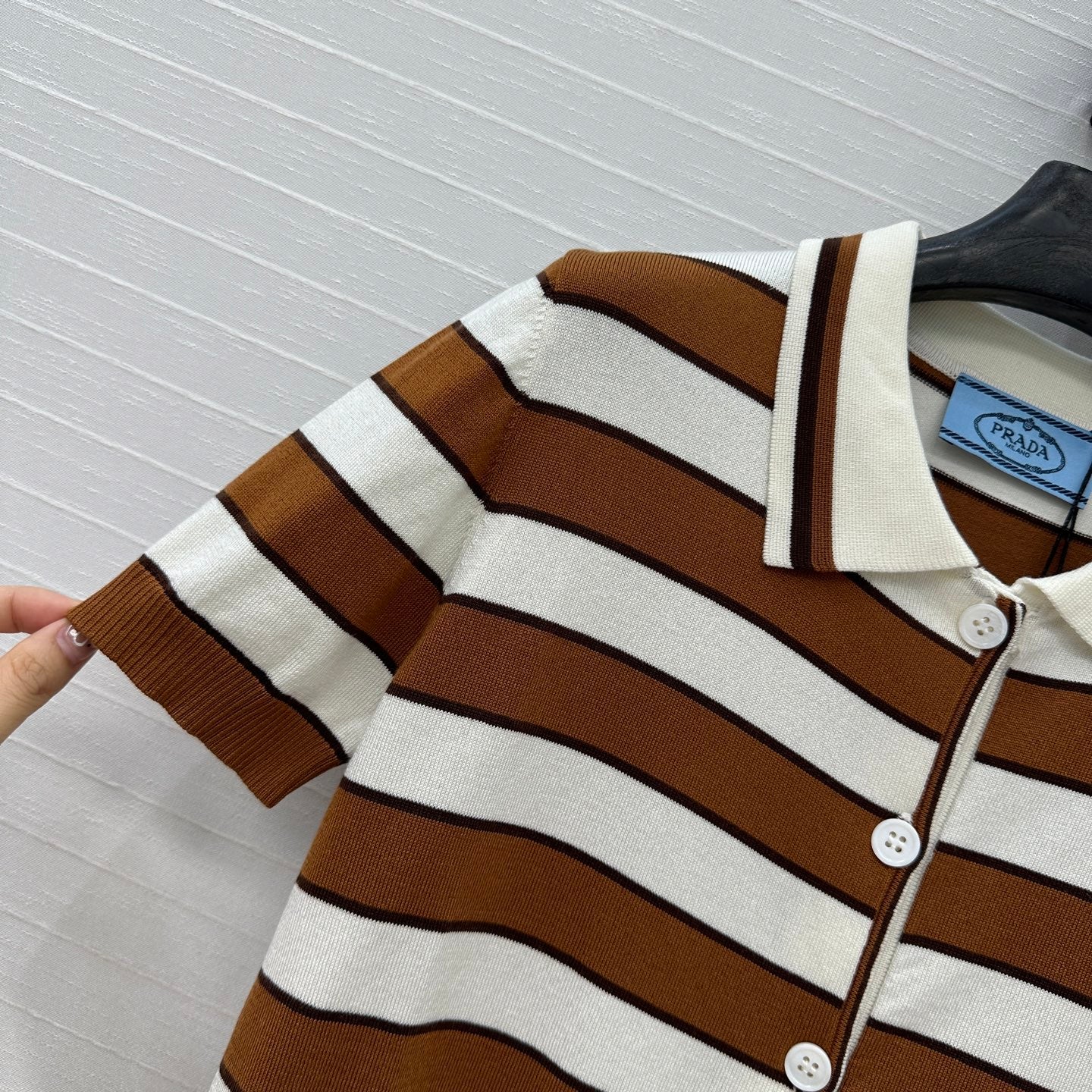 Prada 25 Striped Short-sleeved Knitted Cardigan Brown white Cotton