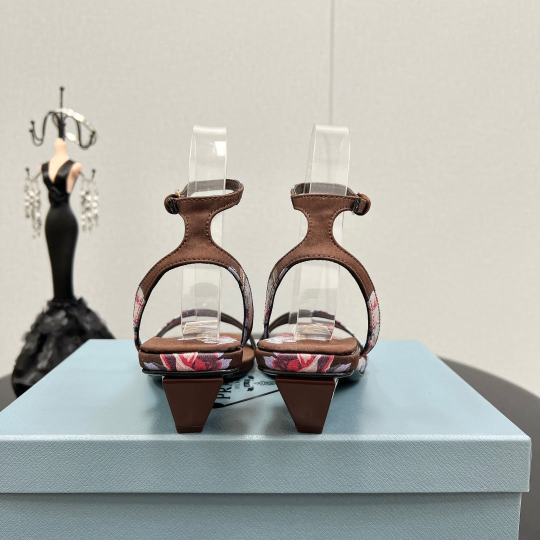 PRA TRIANGLE HEEL FLOWER MOTIF SATIN SANDALS CINNAMON