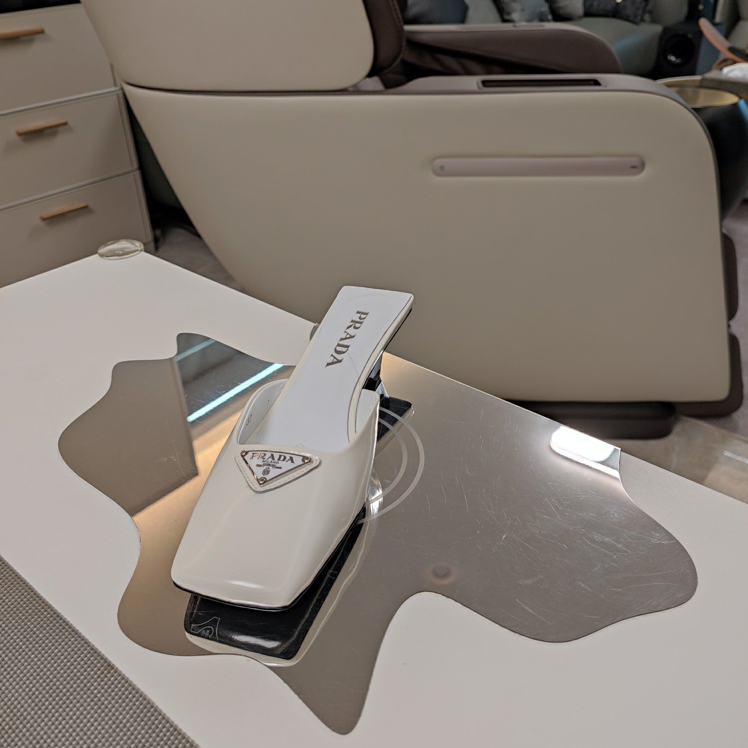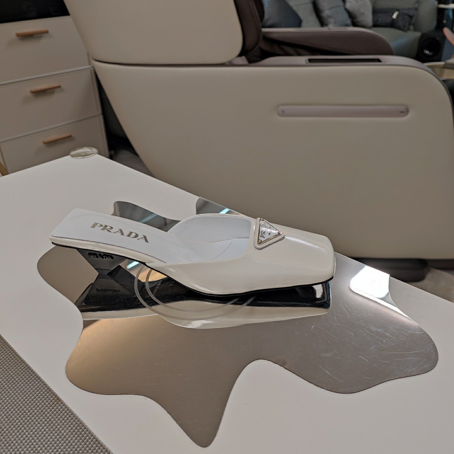 PRA SQUARE TOE MULES WHITE CALFSKIN WITH CHAIN