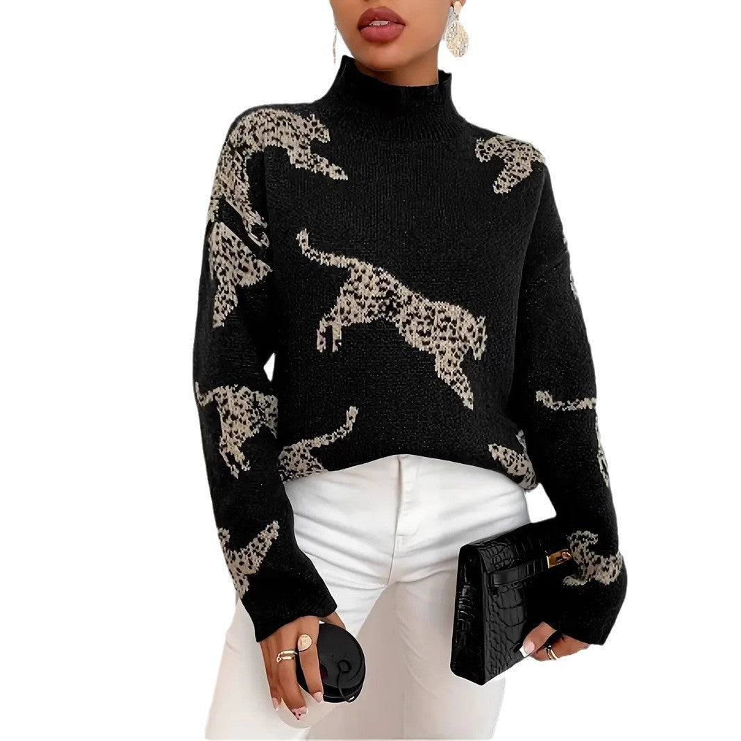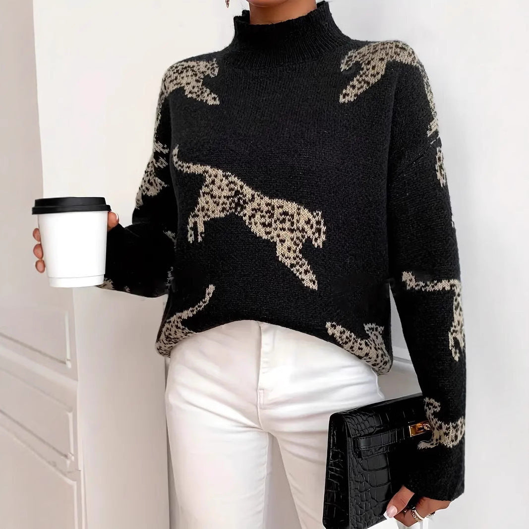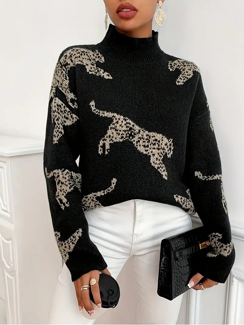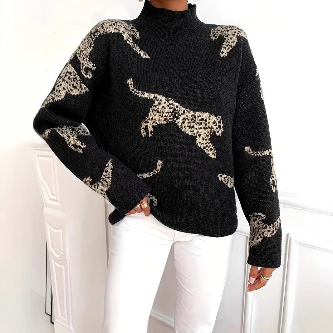 Affichez un style audacieux avec ce pull noir orné de motifs léopard. Son design moderne et son tissu confortable en font une pièce idéale pour un look chic et décontracté. Associez-le à un pantalon blanc pour un contraste élégant et captivant.