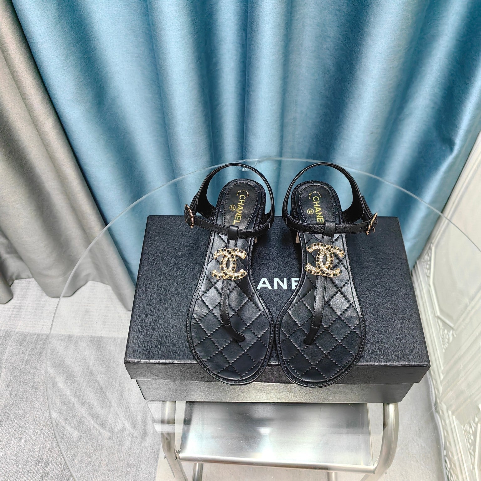 cc thong sandal 40 black calfskin diamond paved logo