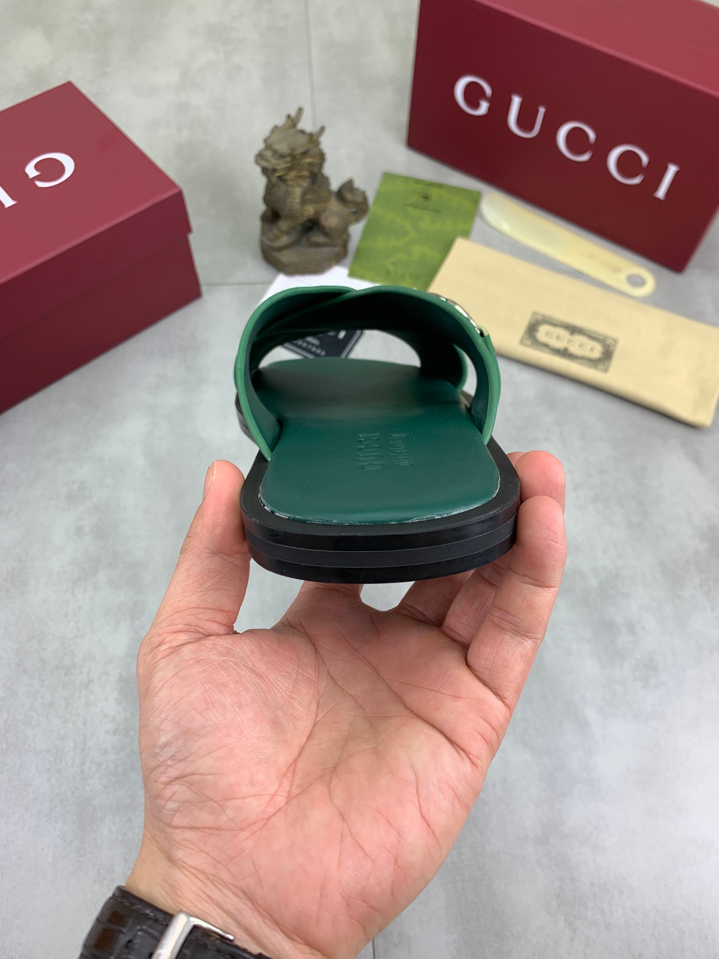 GG Men's 25 Sandals Slide Green Cowhide 738472