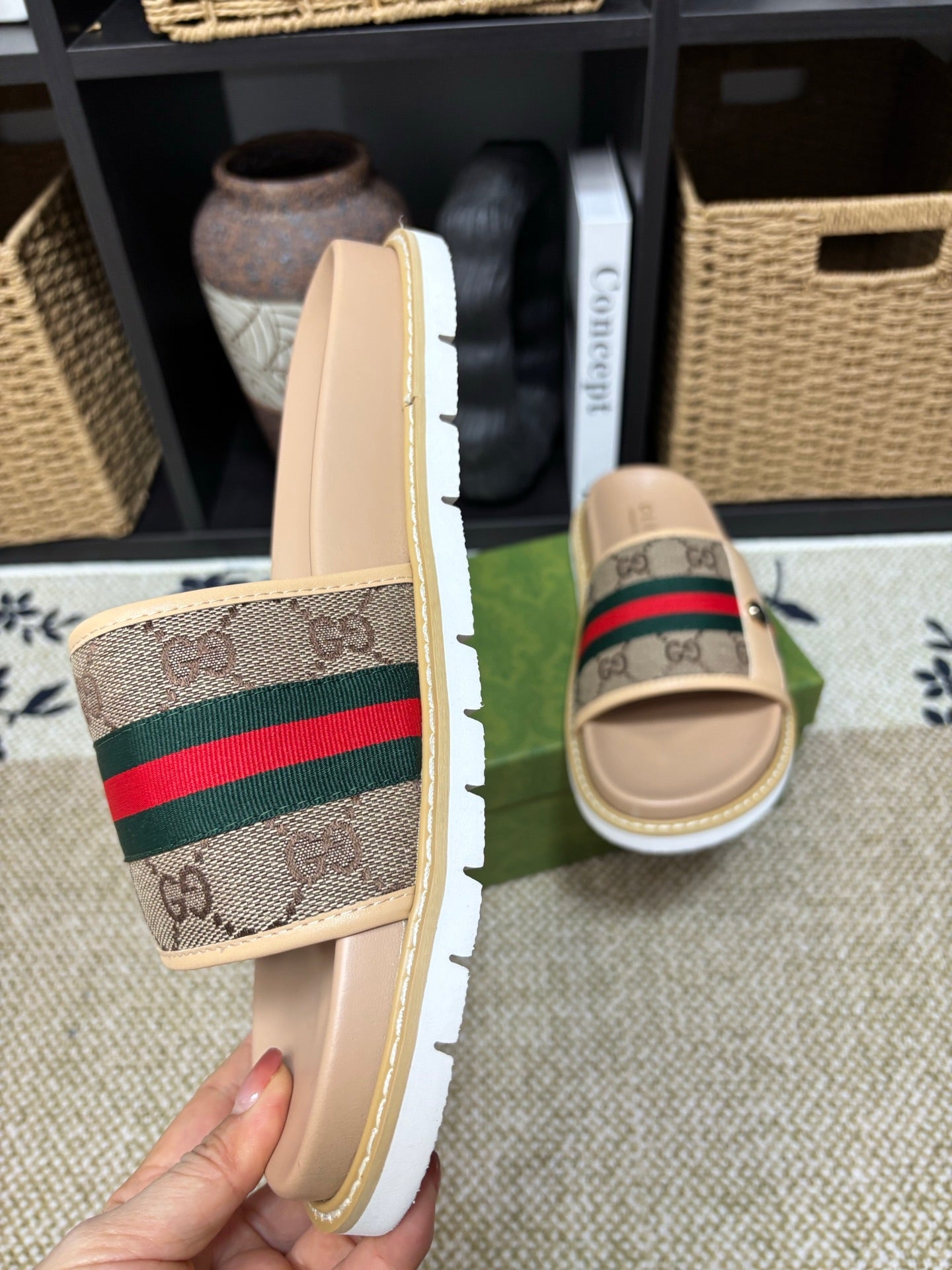 GG Men's Web Slide Beige Canvas Cowhide 595537