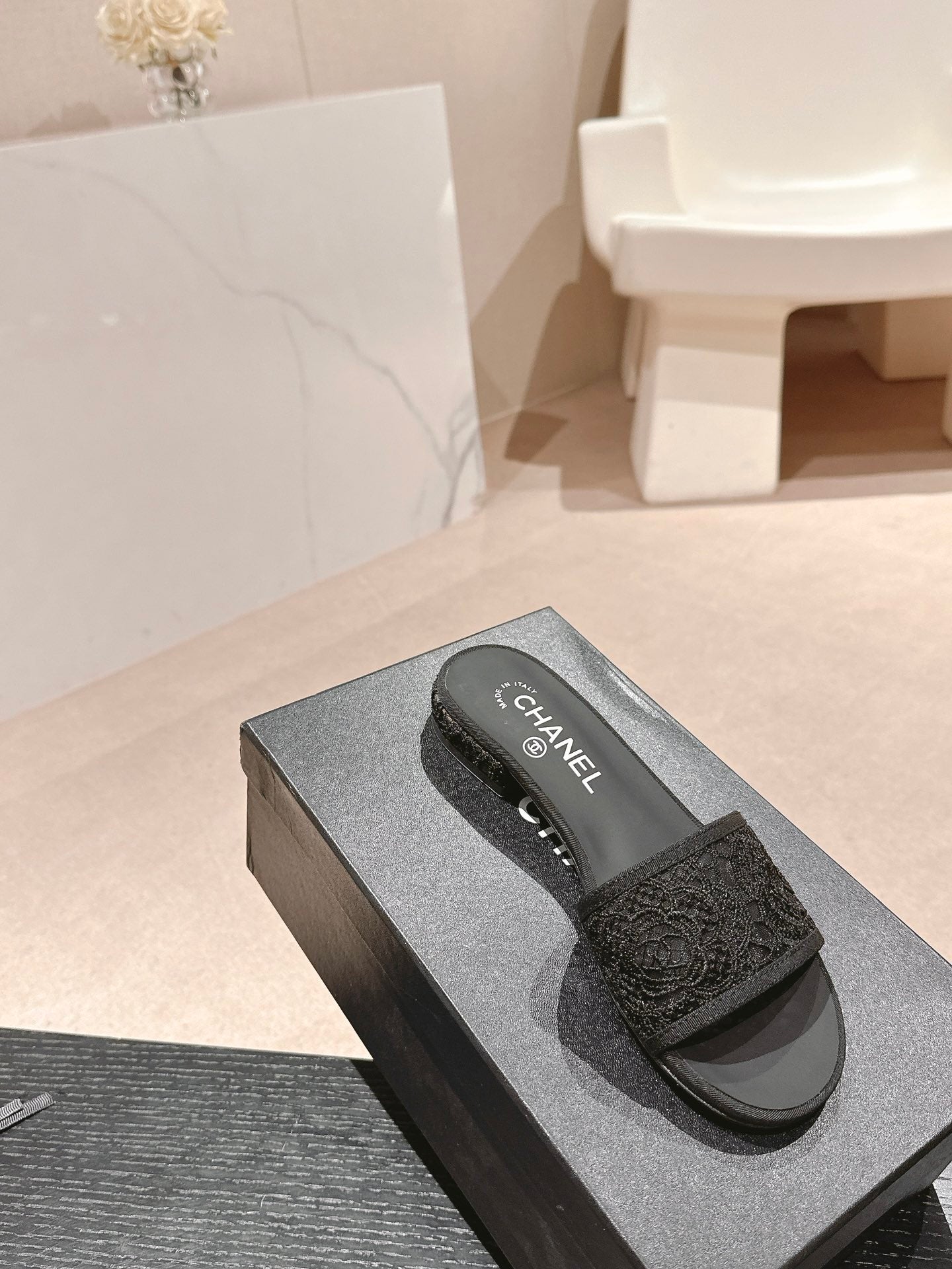 mule sandal black lace fabric
