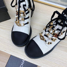CC COMBAT BOOTS IN WHITE WRINKLED CALFSKIN AND BLACK GROSGRAIN WITH FAUX PEARL