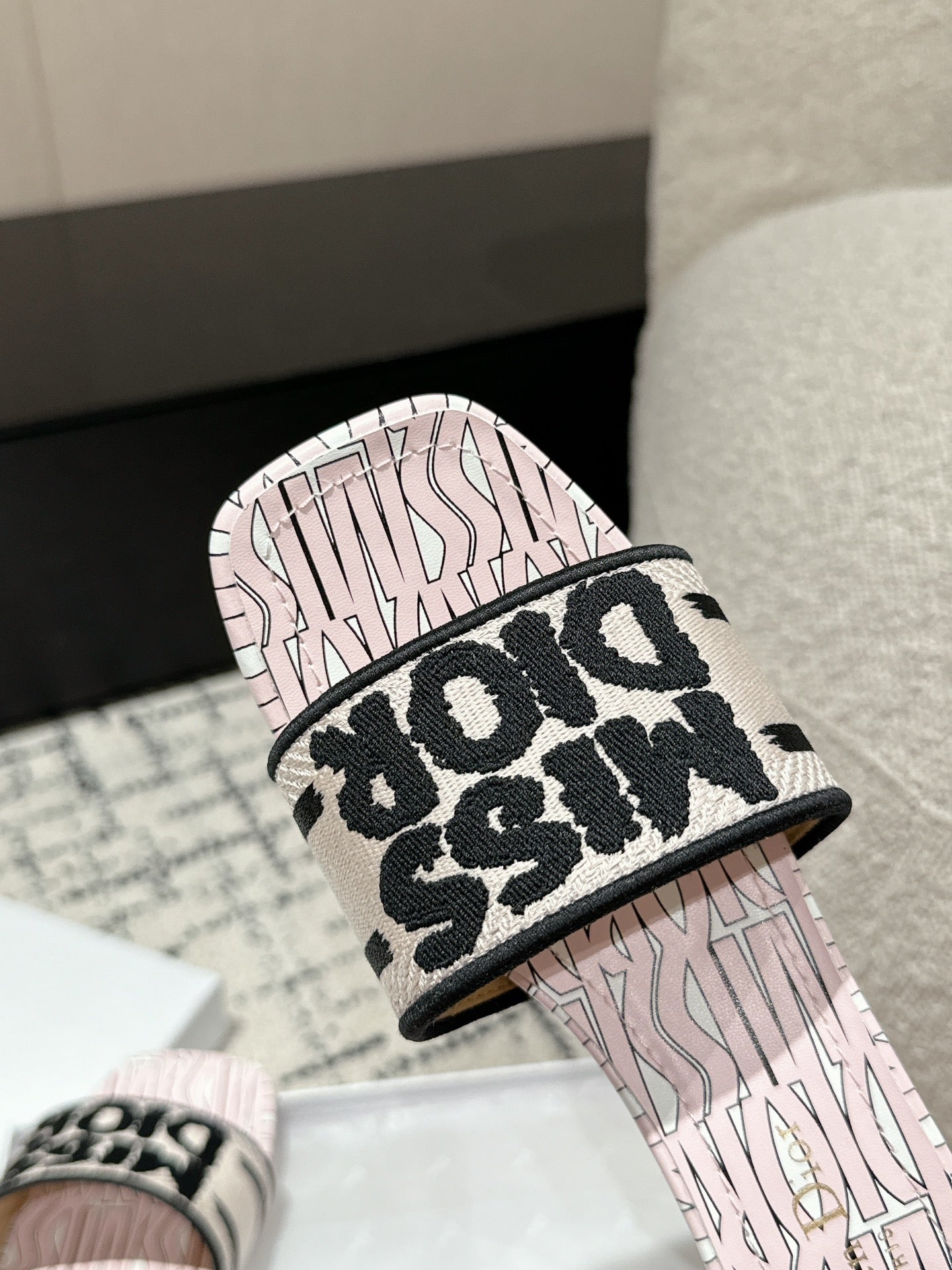 CD Dway Heeled Slide Light Pink Black Embroidered Cotton