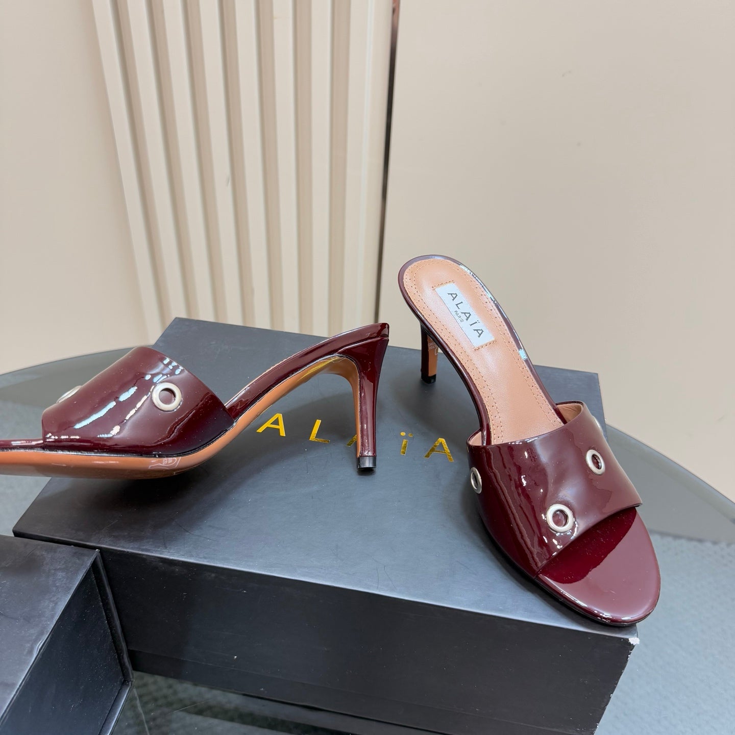 Alaia 2025 Oeillets Embellished Leather Sandals Glossy Black Lambskin 299668
