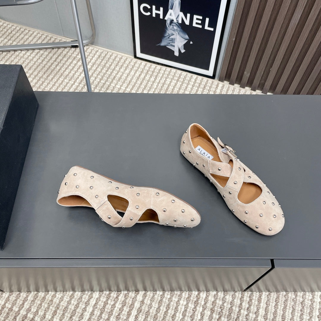 Alaia 2025 Criss Cross With Stud Ballet Flats Brown Beige Suede 293207
