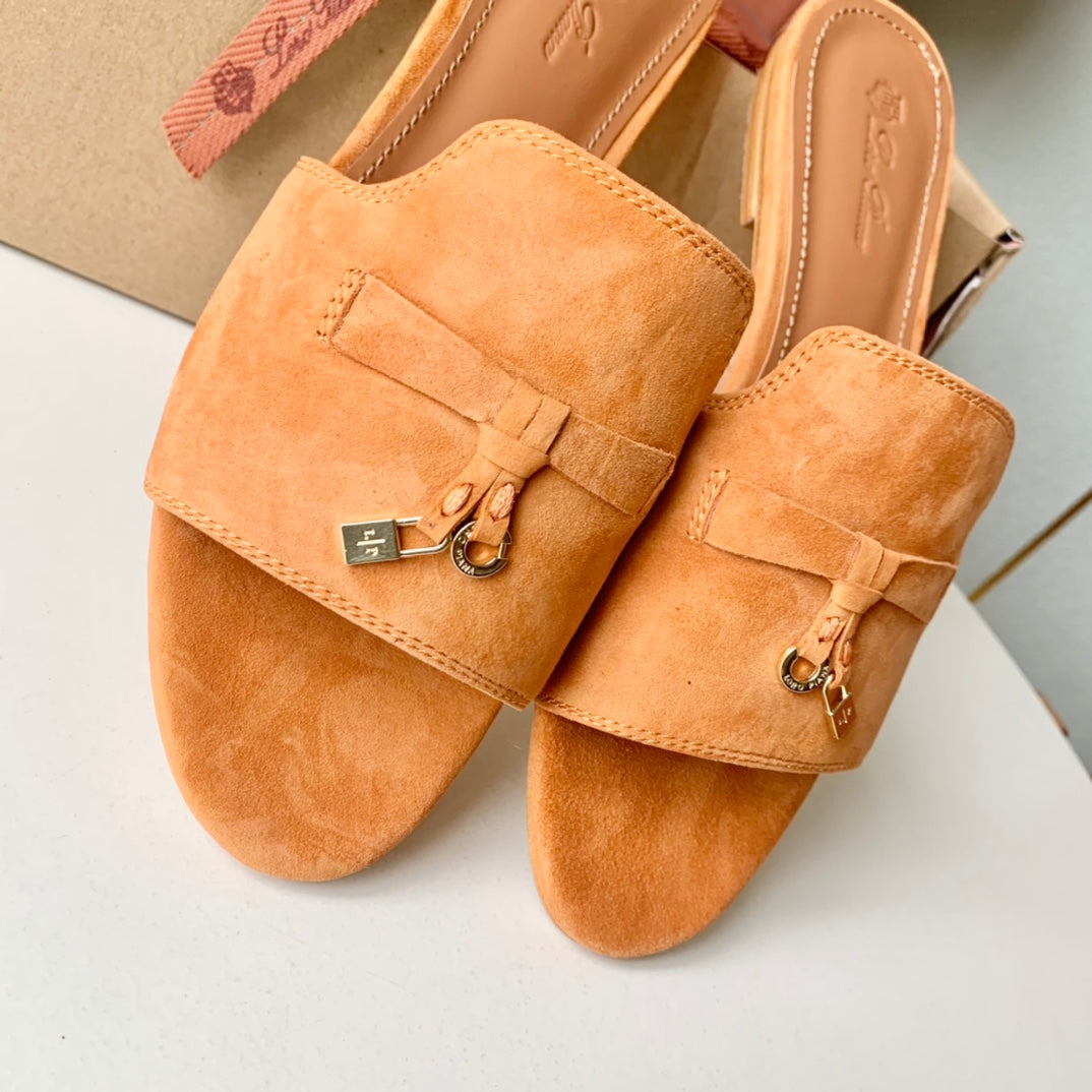 Loro Piana Carrot White Suede Charms Walk Flat Mules