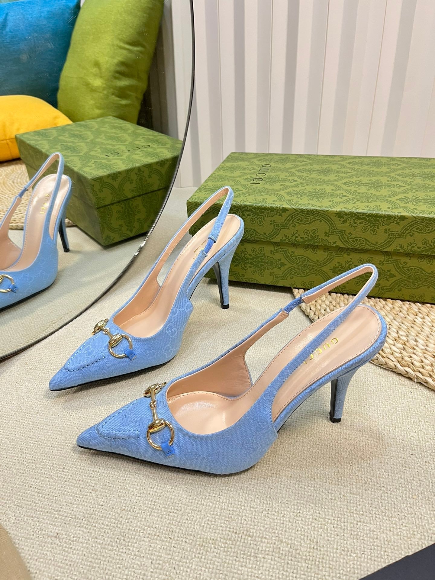 GC Horsebit Slingback Pump 100mm Blue Canvas Sheepskin 294550