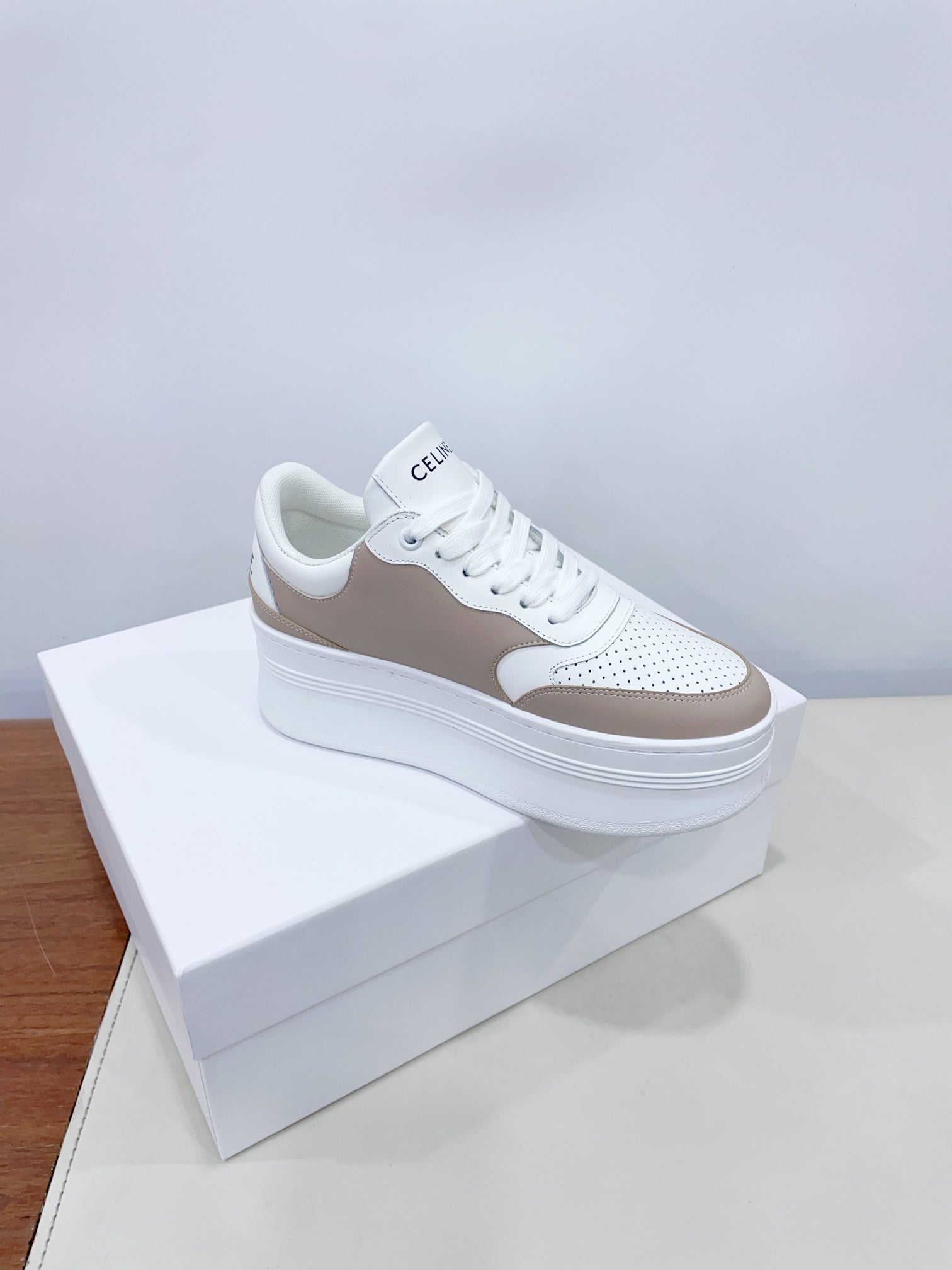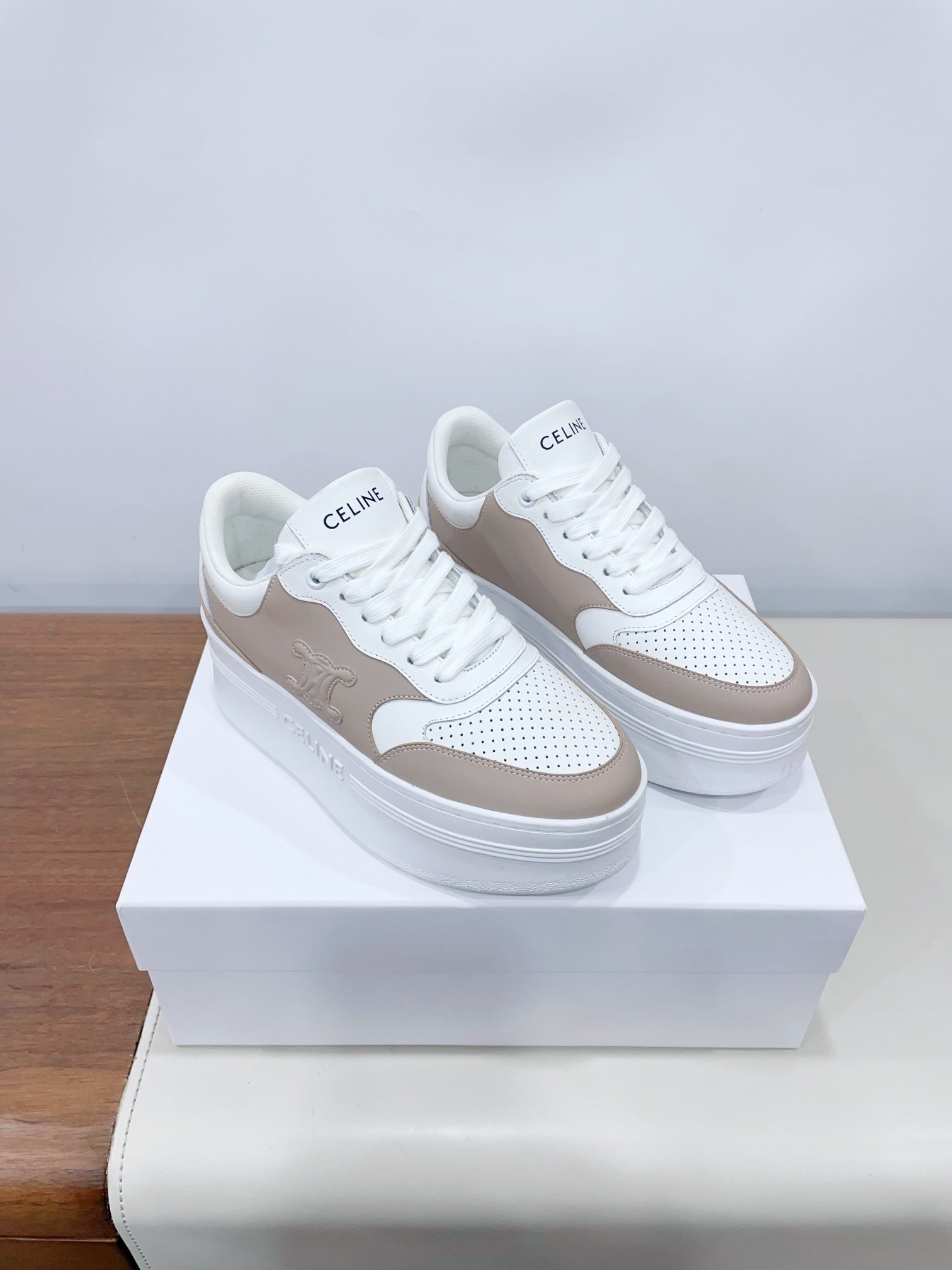 CELINE 25C Block Sneaker White mix Khaki Brown Calfskin 231996