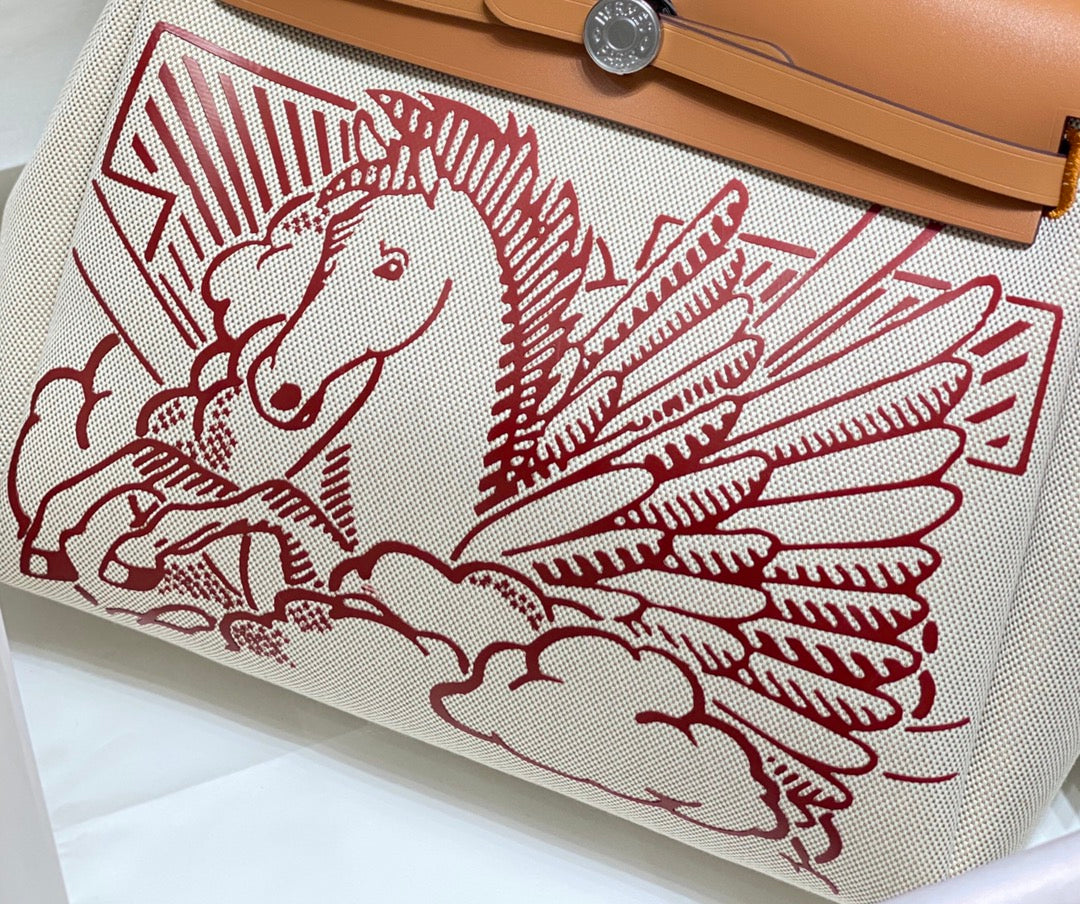 HM Pegase Pop Herbag Zip 31 White Blue Canvas Black Cowhide Leather
