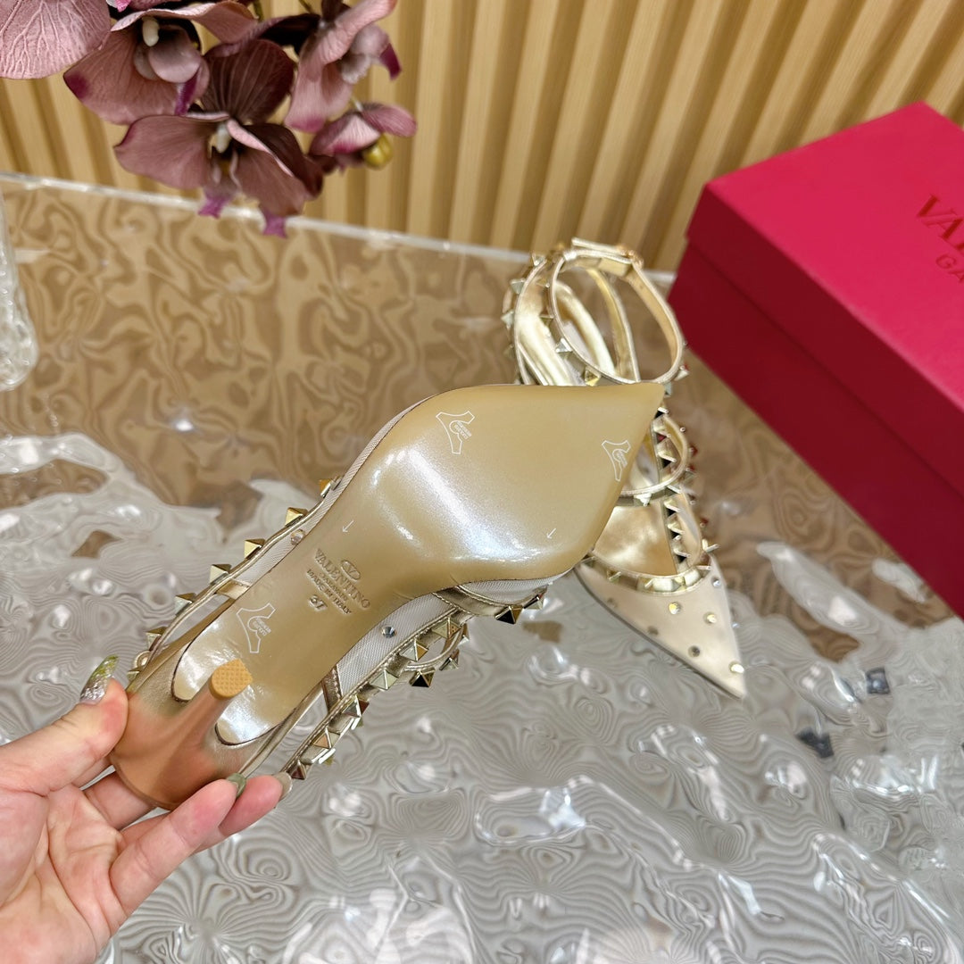 ROCKSTUD MIRROR-EFFECT PUMP WITH MATCHING STRAPS AND STUDS 95 MM GOLD CALFSKIN AND MESH