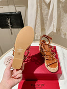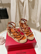 Rockstud Ankle Strap Wedge Sandal In Yam Orange Calfskin Leather And Beige Raffia 100mm 829390