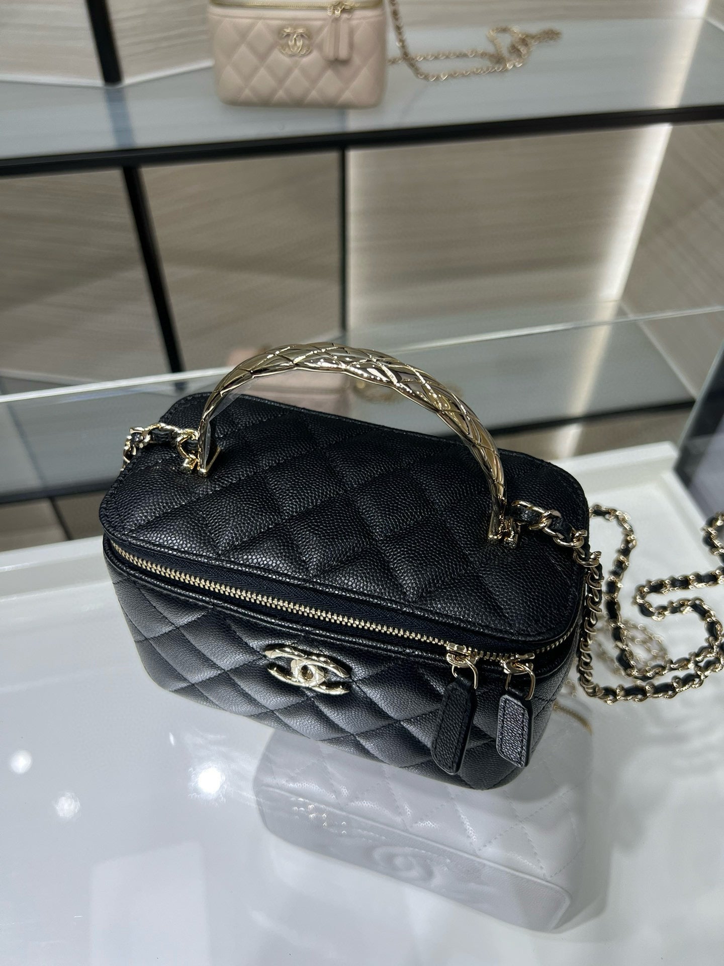 CC 25C Vanity Top Handle 17cm Black Grained Calfskin Light Gold Hardware