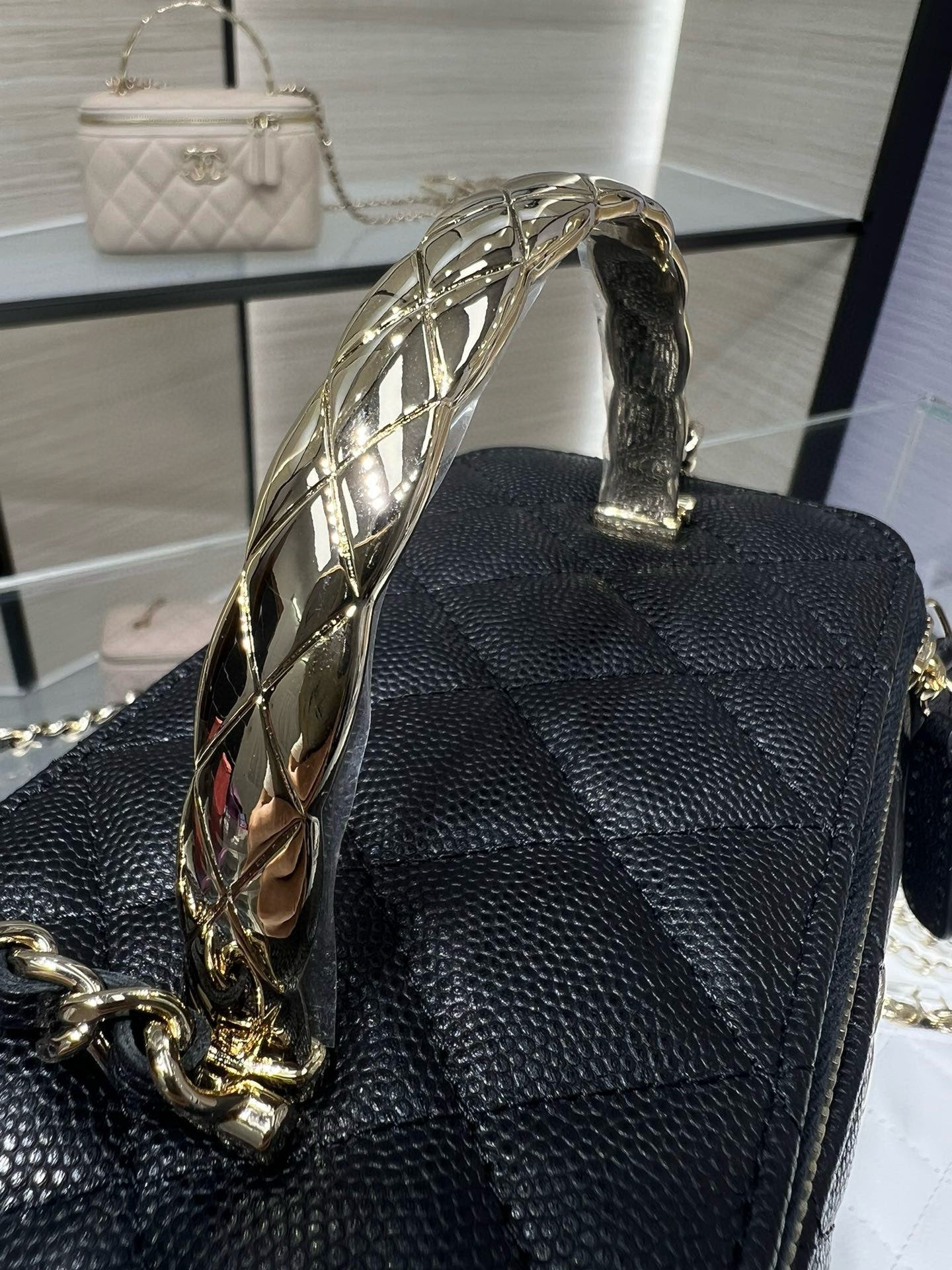 CC 25C Vanity Top Handle 21cm Black Grained Calfskin Light Gold Hardware