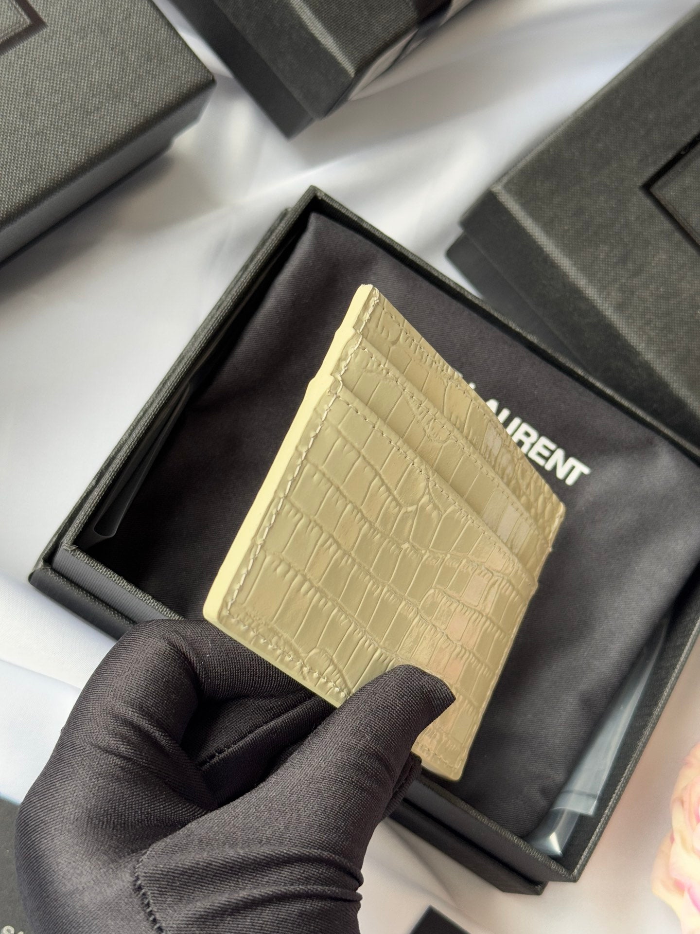 YSL Card Holder 10cm Wallet Beige Gold Crocodile Leather 240555