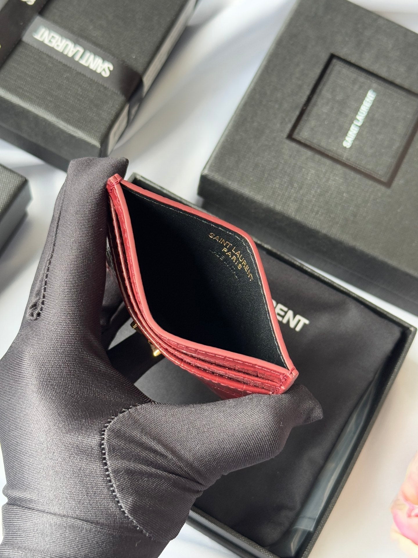 YSL Card Holder 10cm Wallet Red Gold Crocodile Leather 240563