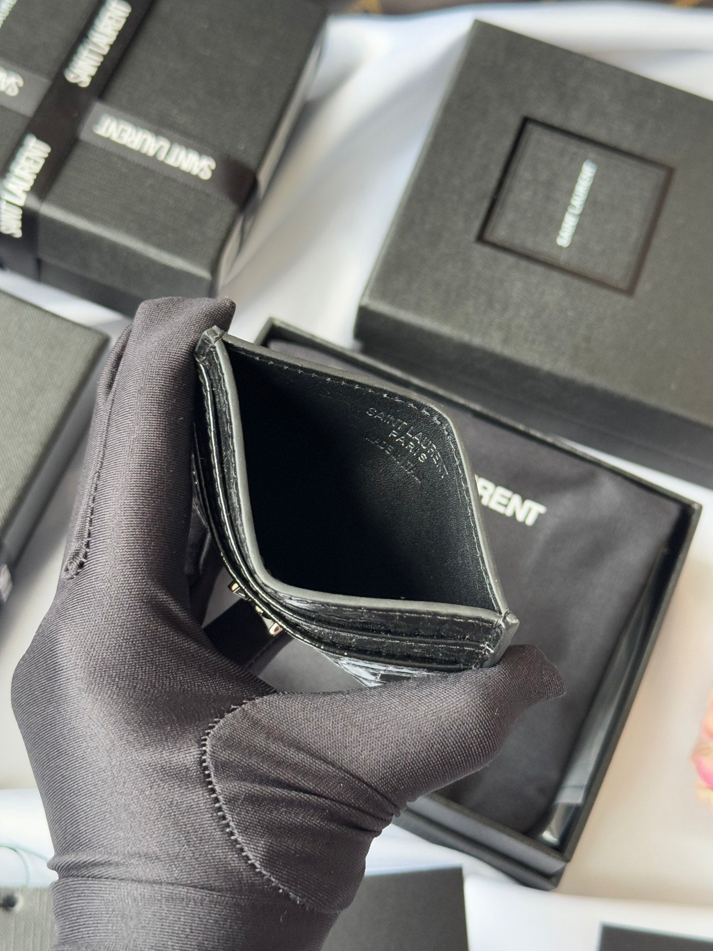YSL Card Holder 10cm Wallet Black Gold Crocodile Leather 240550