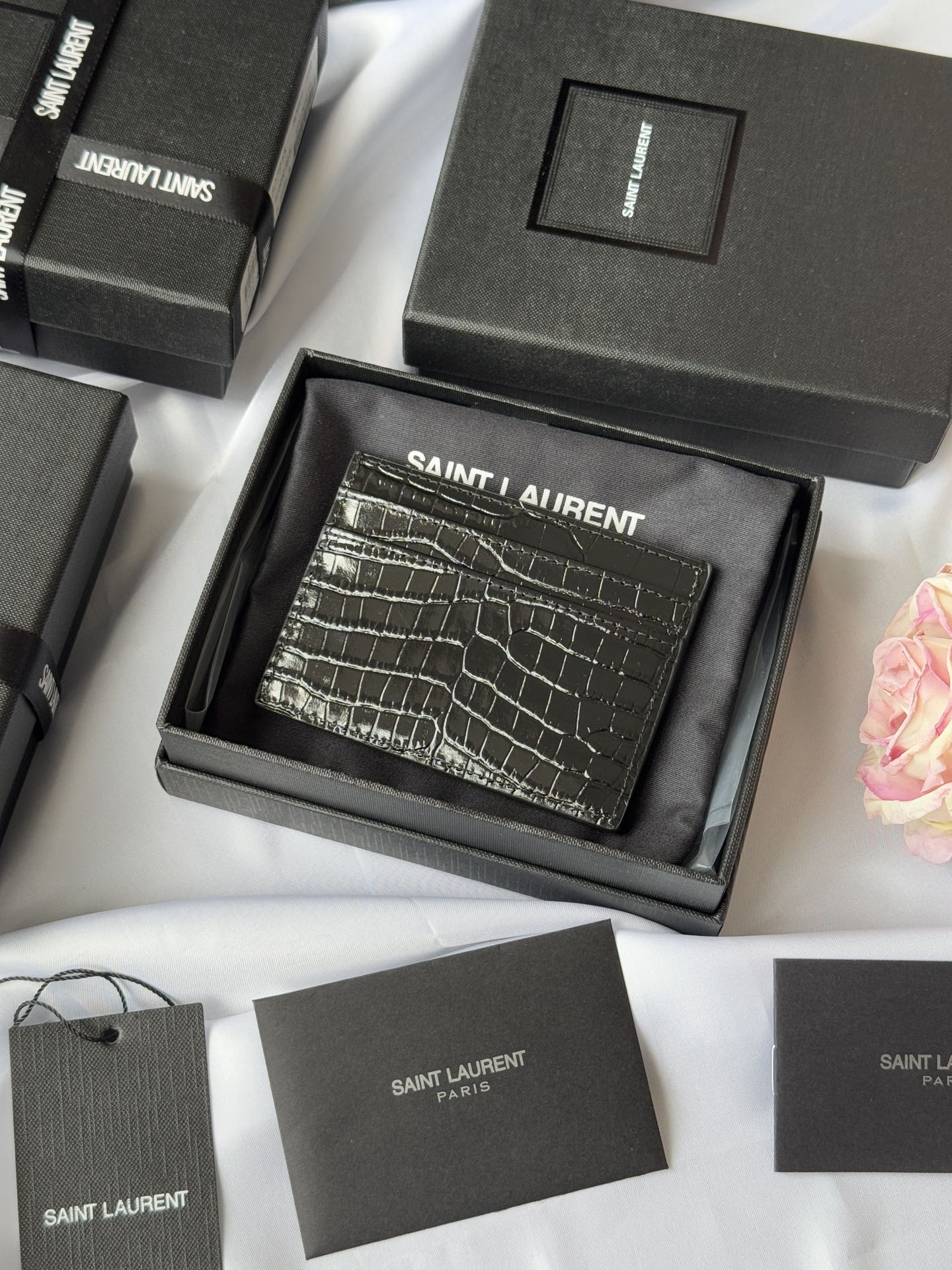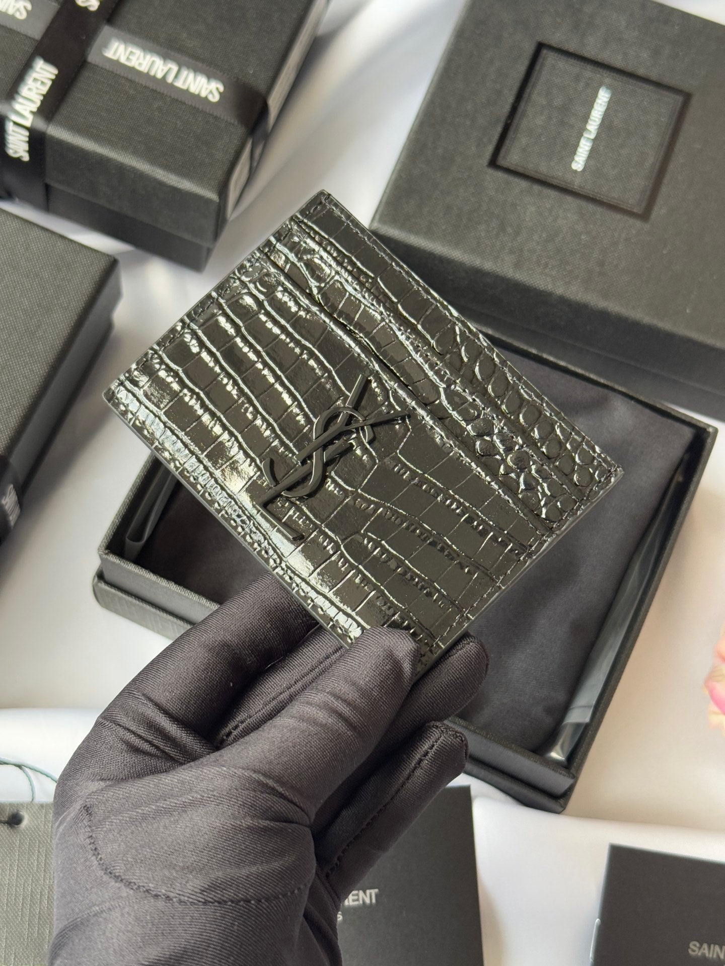 YSL Card Holder 10cm Wallet Full Black Crocodile Leather 240552