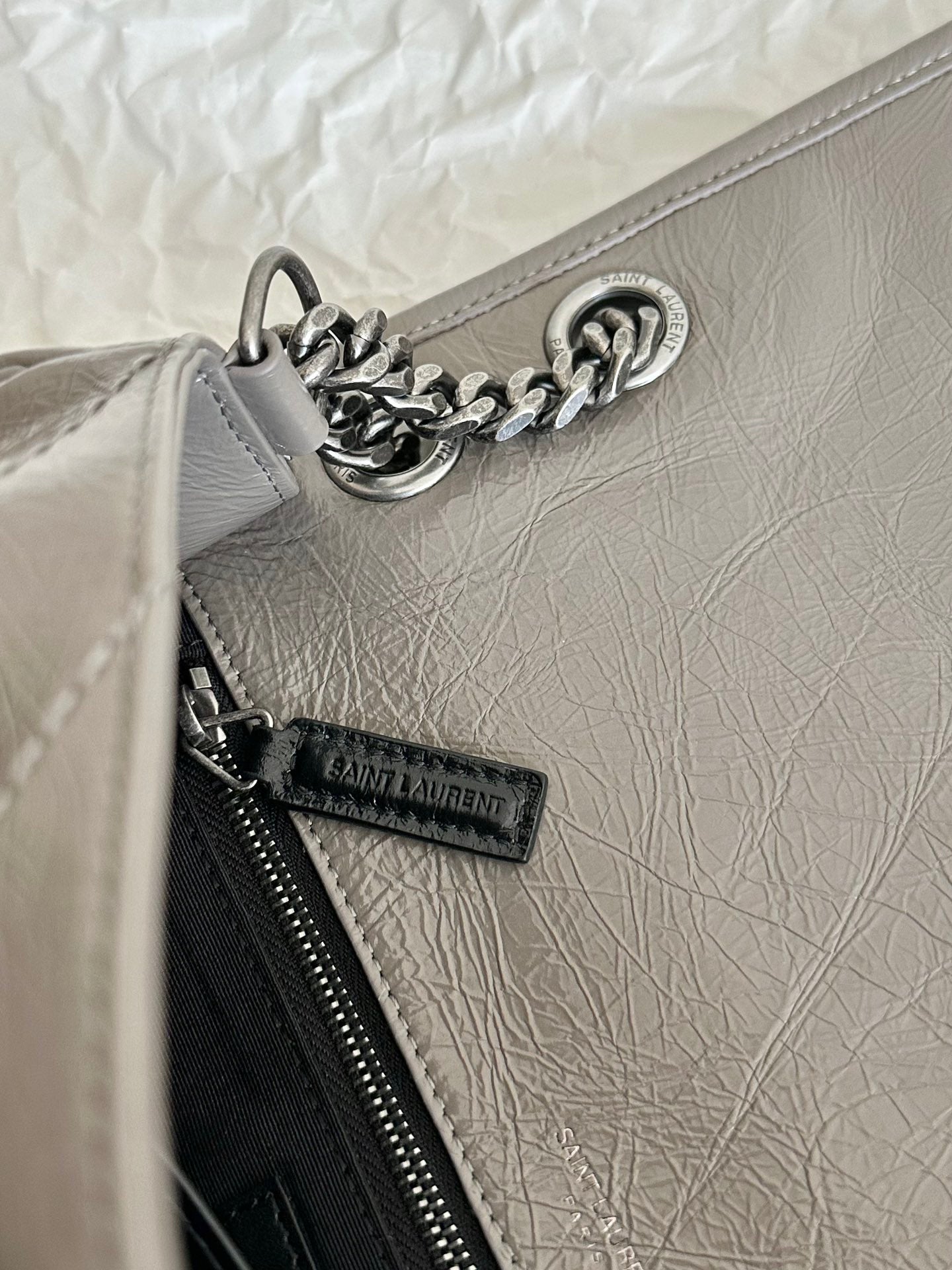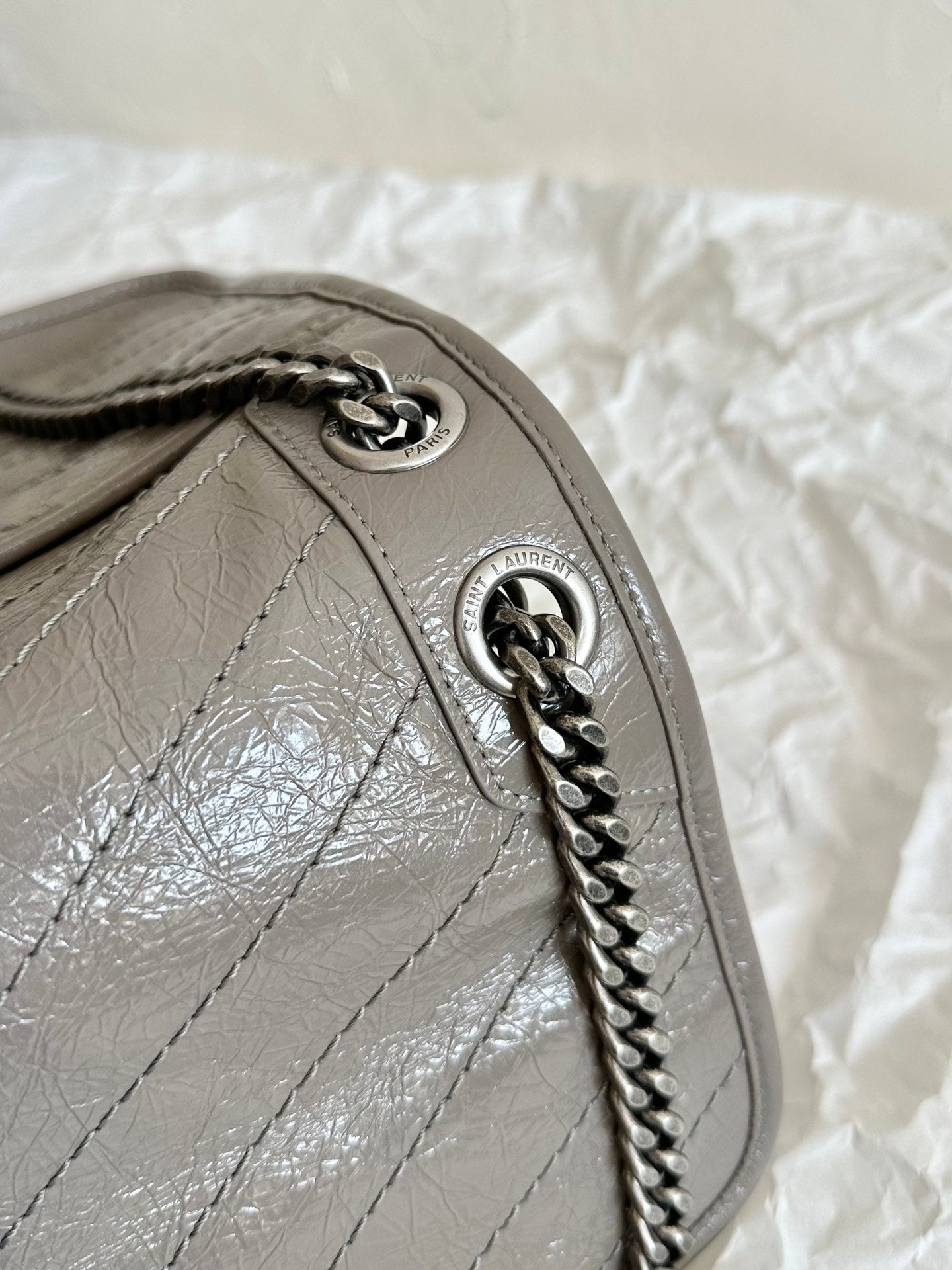 YSL Niki Medium Bag 28cm Grey Crinkled Vintage Leather