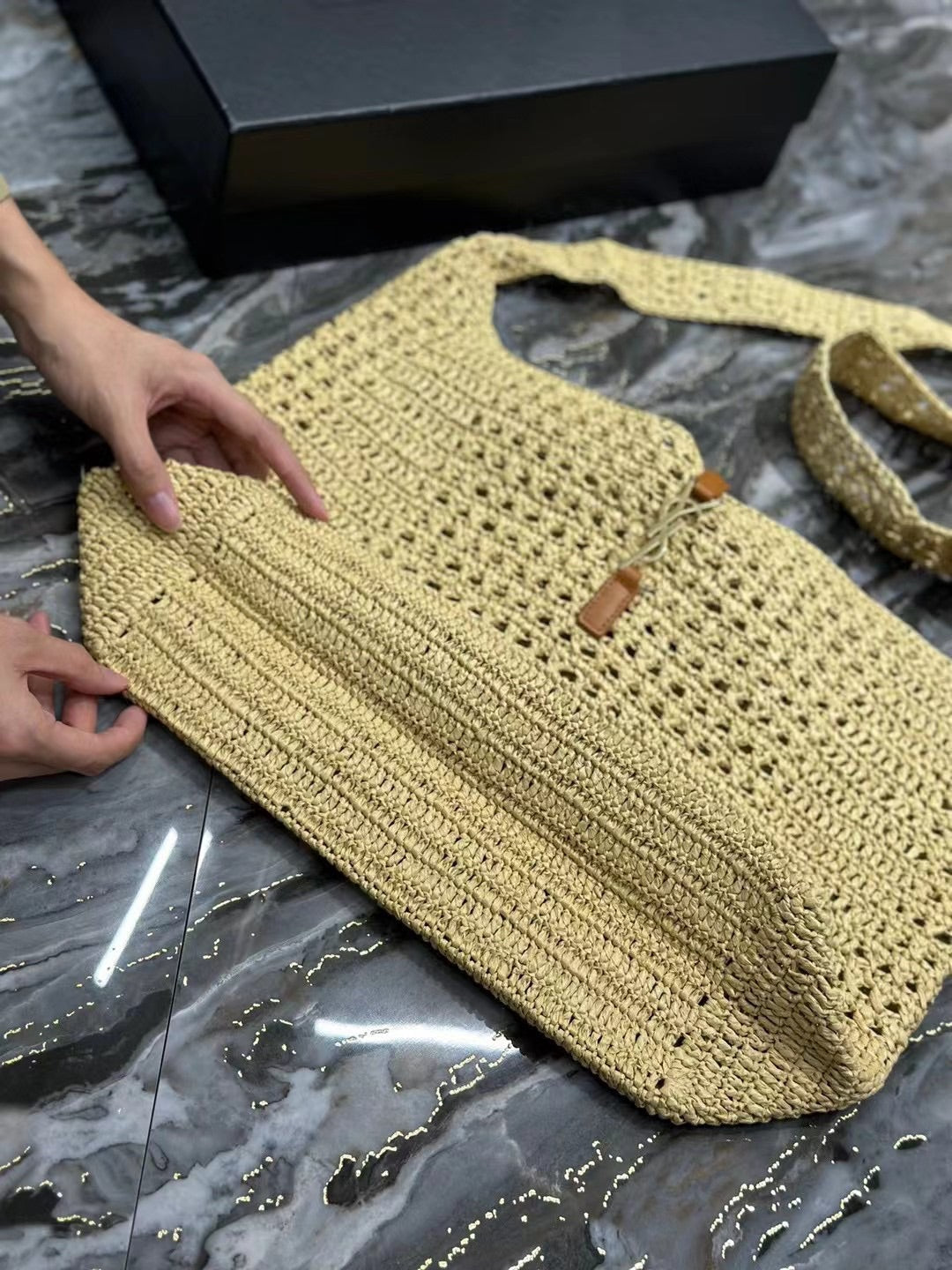 YSL PANIER BAG 55CM BLACK CROCHET RAFFIA TAN CALFSKIN