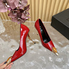 ORANGE GEM-STUDDED HIGH PUMPS IN RED PATENT CALFSKIN