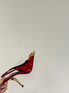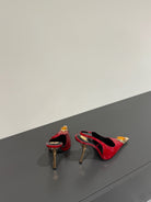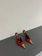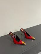 ORANGE GEM-STUDDED SLINGBACK PUMPS IN RED PATENT CALFSKIN